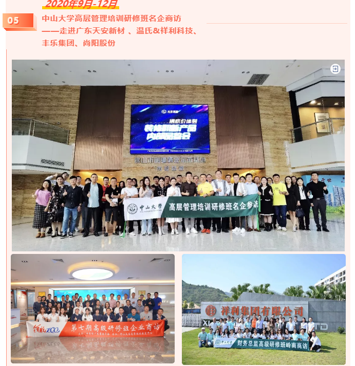 2020年9月-12月,yl9193永利集团高层管理培训研修班举办名企参访活动,走进优秀校友企业:广东天安新材料股份有限公司、温氏食品集团股份有限公司、广东丰乐集团有限公司、尚阳科技股份有限公司等。以上校友名企与学校在人才培养方面合作紧密。读万卷书,行万里路。组织学员们走进名企考察、交互教学是研修班的主要特色之一。不仅增加了班级各行各业的学员之间的了解,更能促进拓展学员的跨界视野和企业家管理思维,期待未来更多学习交流活动的开展。