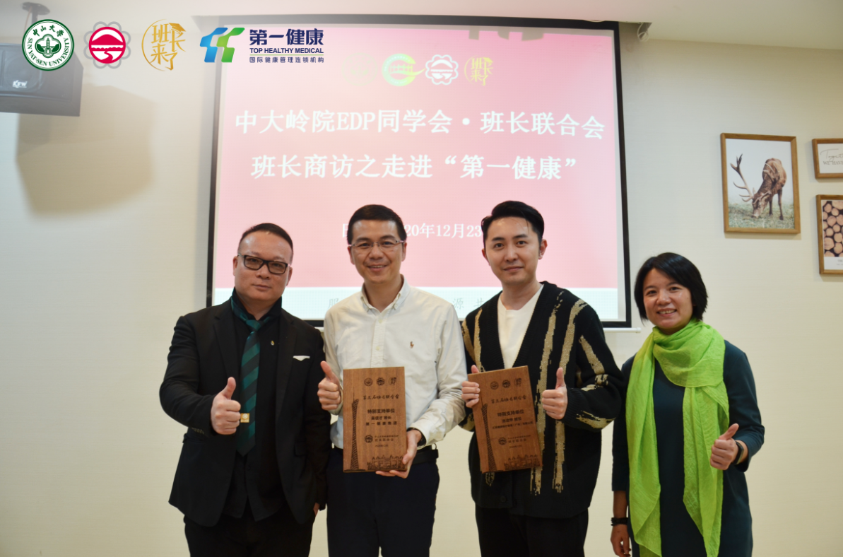 为感谢“第一健康”对中大岭院EDP同学会·班长联合会活动的大力支持,yl9193永利集团岭南学院EDP同学会副会长、班长联合会主席方瑞喜班长和企业管理培训中心校友事务部部长陈月卉老师代表班长联合会为执行主席吴佳才班长的企业“第一健康”和班长联合会执行主席池浚烨班长的企业“汇昇健康医疗管理(广州)有限公司”颁发“特别支持单位”。希望未来能够携手前行,共同组织更多高质量的班长交流活动,全力践行班长联合会宗旨:引领班级,联合校友,创造价值,服务社会。