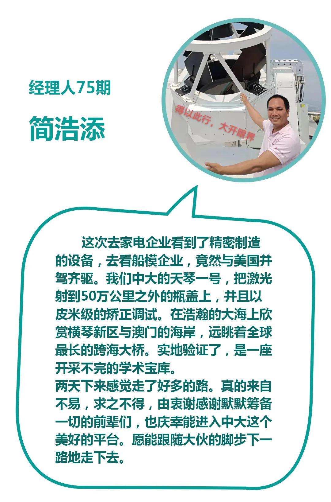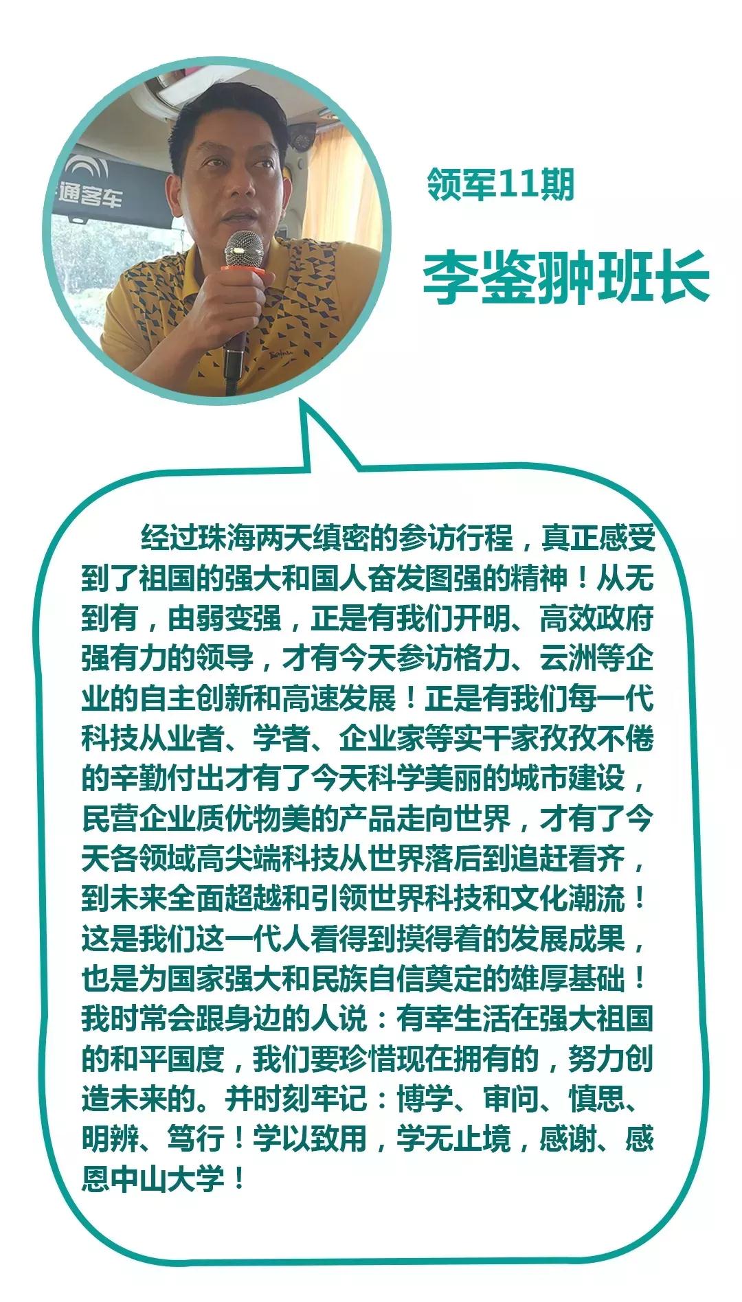 两天的考察学习时间很短,但是班长们认真投入、热情交流。开阔了眼界、也收获了这份珍贵的中大同窗情谊,还充份感受到了“珠海”这个科技发达、极具创新精神及国际化发展城市的魅力。