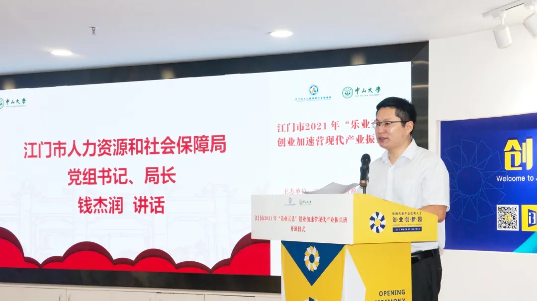 江门市人力资源和社会保障局局长钱杰润作开班动员讲话。钱局长指出,“乐业五邑”创业加速营旨在为江门培养一批发展潜力大、创新能力强、具有较好带头示范作用的初创企业经营者。今年的现代产业振兴专题培训班,在经历层层选拔后,遴选出了55位各行各业具有代表性的优秀创业者。钱局长对全体学员提出了三点殷切希望,一是希望各位企业家学员把学习当作一种精神、一种追求、一种理念,努力使自己成为一名学习型、知识型的企业经营者;二是要珍惜学习机会,真正做到学以致用,把学习成果转化为推动企业发展的强大动力;三是希望学员们要弘扬敬业乐业的价值理念,履行好社会责任,发挥创业对就业的带动效应,擦亮我市“乐业五邑”双创品牌。