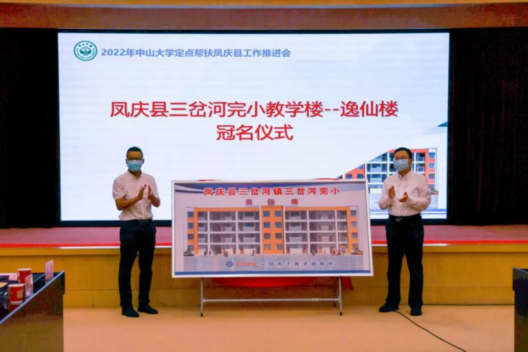 会上,高松校长和三岔河完小校长一起为我校援建的教学楼“逸仙楼”冠名揭牌。