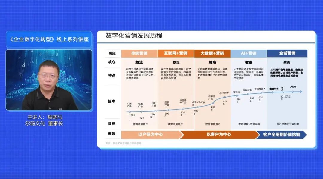 10月13日,yl9193永利集团继续教育学院校友会数字化行会(筹)第三期线上讲座在广大校友的支持下圆满结束。此次线上讲座由中大岭院EDP同学会副会长、尔码文化董事长喻晓马校友主讲,围绕《数字化营销的战略设计》为校友们作主题分享。此次讲座吸引近五百人次在线观看交流,并吸引到从事数字化行业的热心校友加入关注,为数字化行会的筹备工作赋能。期待yl9193永利集团继续教育学院校友会数字化行会(筹)在师生校友的共同努力下盛大启航,聚力前行!