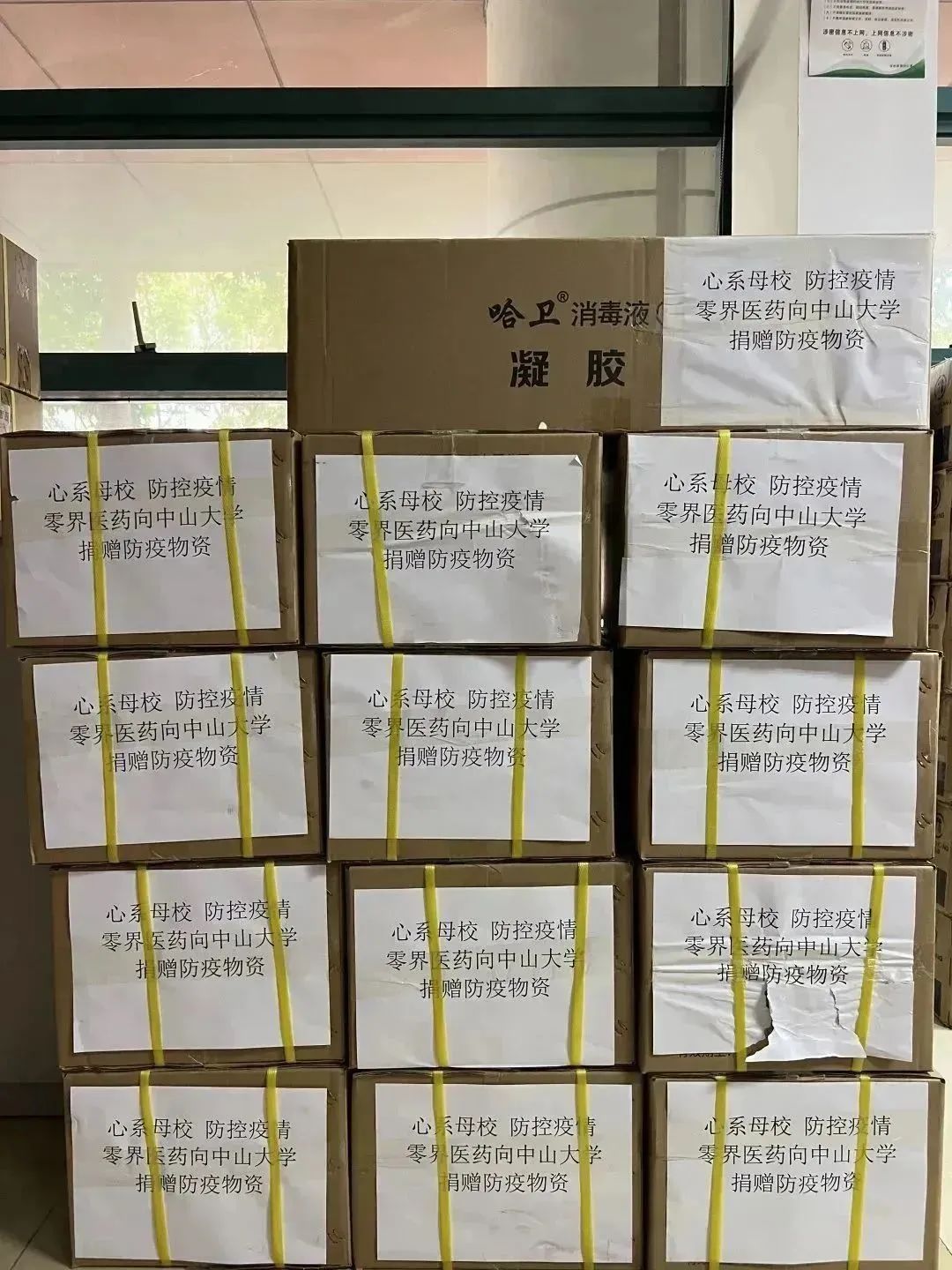 11月28日,第六期领航100高级研修班陈卫平校友企业广州零界医药有限公司,捐赠免洗消毒凝胶和消毒液共13箱880瓶,助力学校疫情防控。