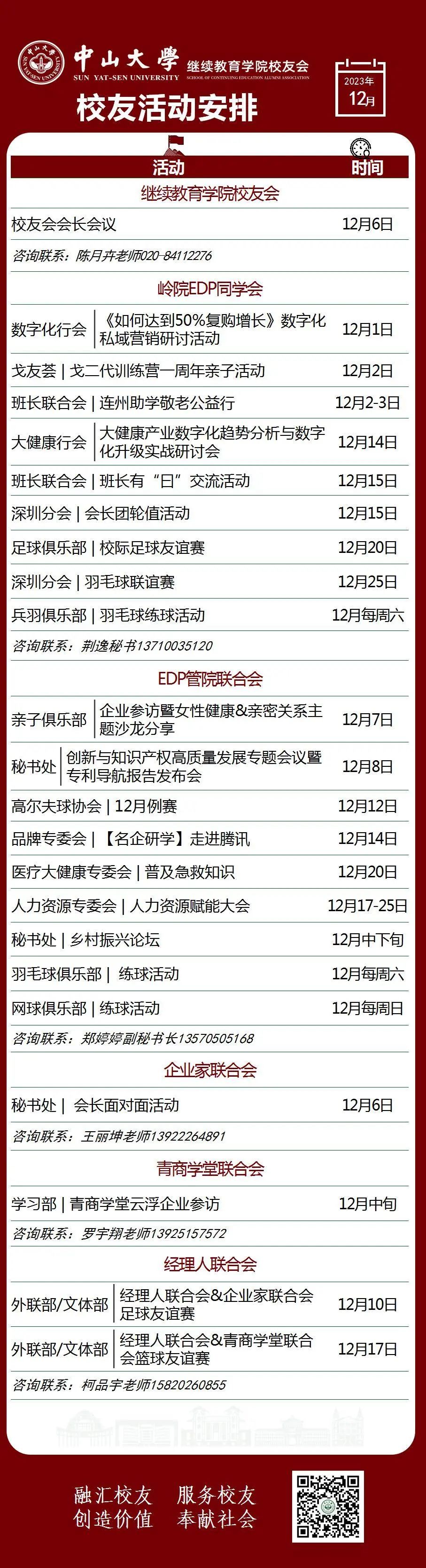 校友活动月报: 传递最新校友活动播报。金菊飘香喜相逢,2023年11月,校友会各分组织多场精彩纷呈的活动竞相绽放。链接校友,创新价值,打造高质量校友交流平台,欢迎校友们关注支持,一起向未来!