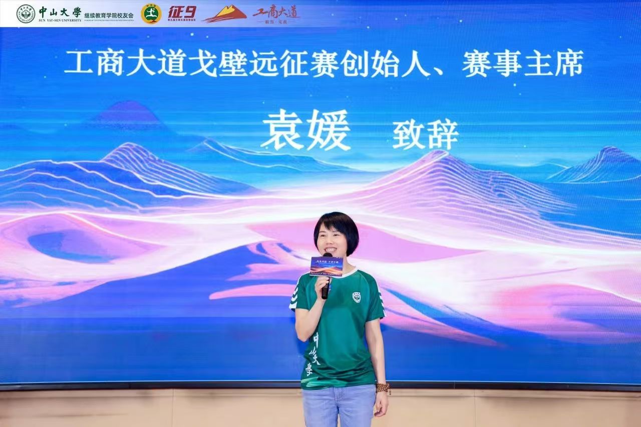 工商大道戈壁远征赛创始人、赛事主席袁媛女士发言,感谢中大对戈壁远征赛事一直以来的参与和付出,着重赞美了中大征九团队的表现,并祝福中大征十团队能够不负期望,再续辉煌。