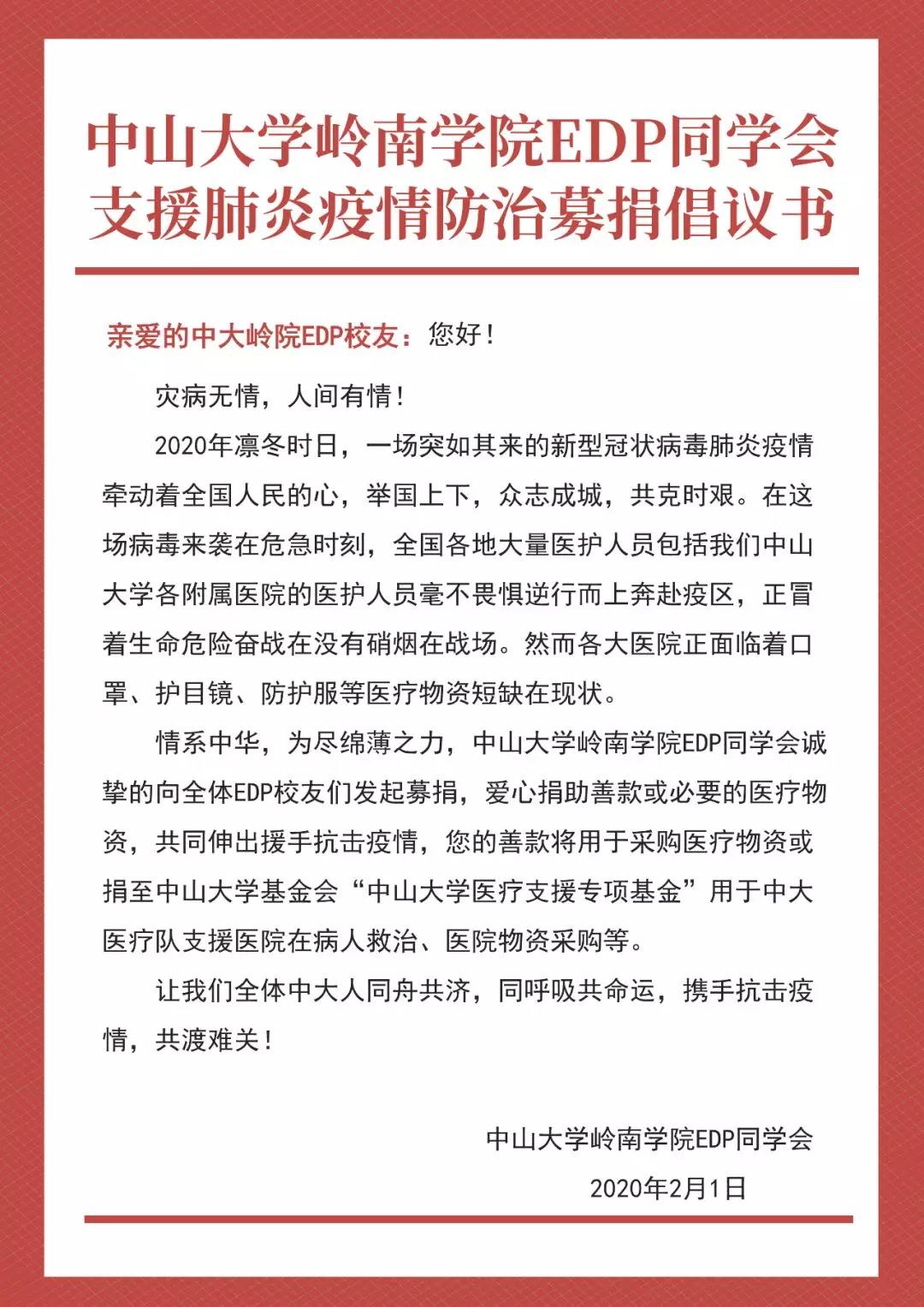 2月1日,经过中大EDP中心老师与同学会会长沟通,最终决定马上成立募捐工作组,以同学会的名义发动募捐,号召校友尽我们的绵薄之力,助力祖国渡过本次难关,打赢新冠病毒肺炎的保卫战!