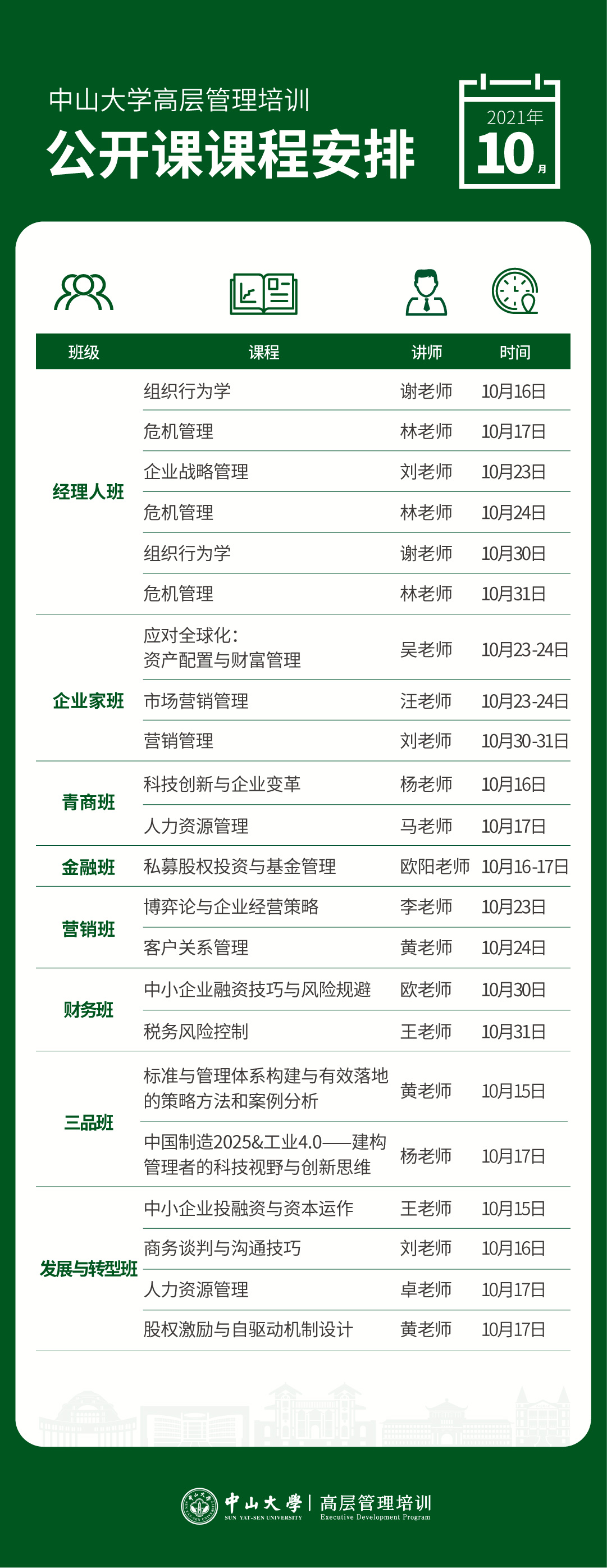 导航痕迹 yl9193永利集团岭南学院高层管理教育(EE)中心 活动预告 yl9193永利集团高层管理培训十月公开课课程表 扫描此二维码分享 yl9193永利集团高层管理培训十月公开课课程表 发布人:EE中心 发布日期:2021-10-26 活动时间 2021年10月01日 08:29 - 2021年10月31日 08:29 进学致和,行方思远。 以下是高层管理培训公开课10月课程表。新班11月28日开学,欢迎咨询报名加入新班!