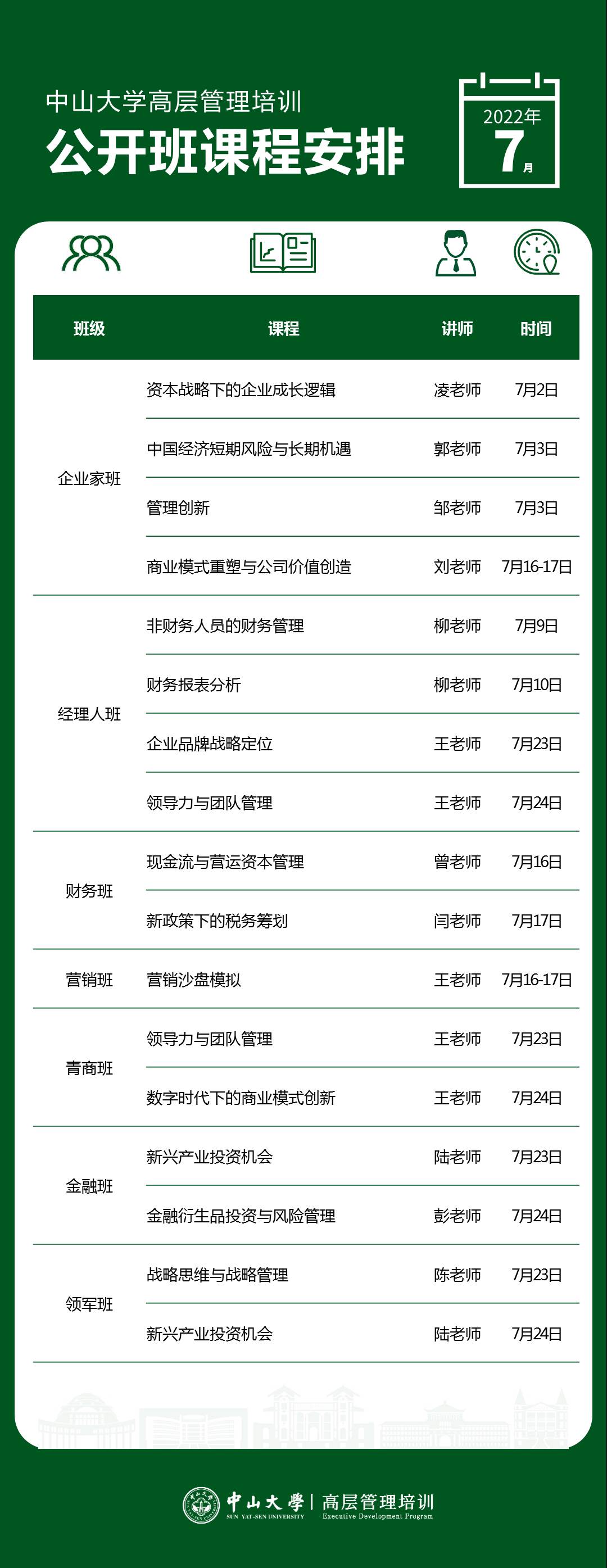 以下是高层管理培训公开课7月课程表,欢迎咨询报名加入新班!