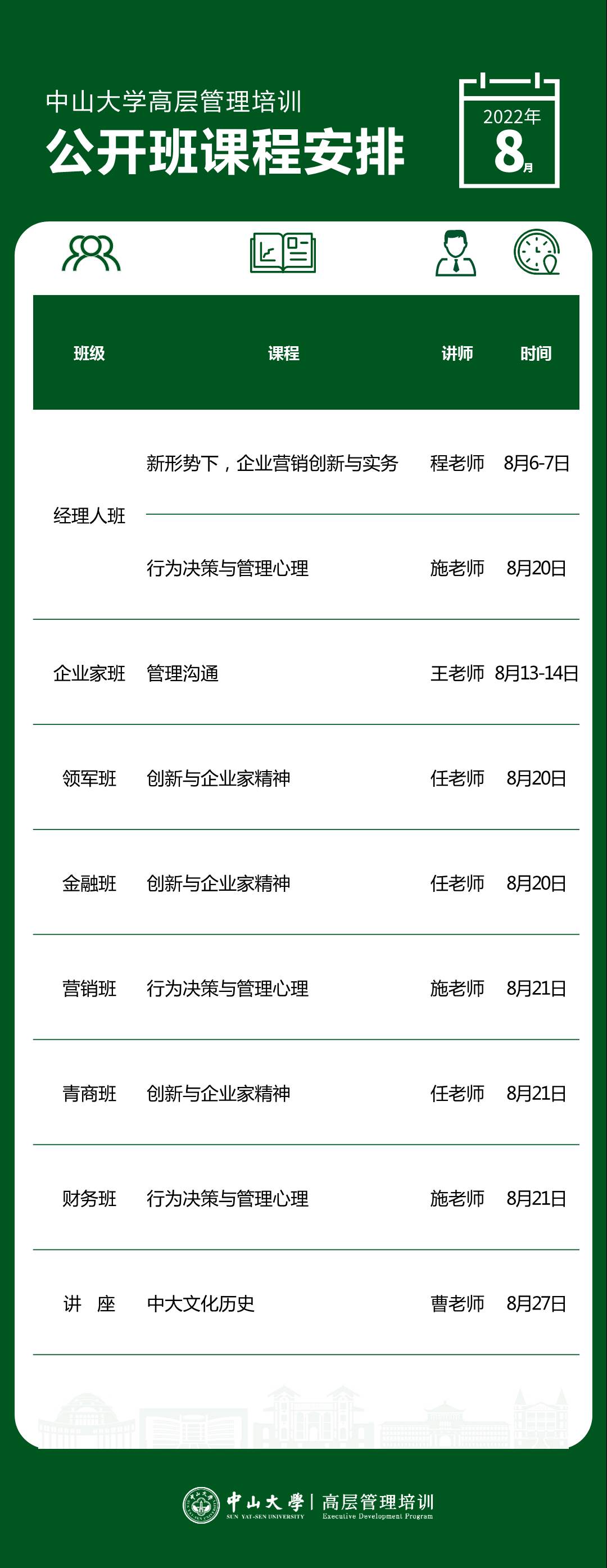 以下是高层管理培训公开课8月课程表,欢迎咨询报名加入新班!