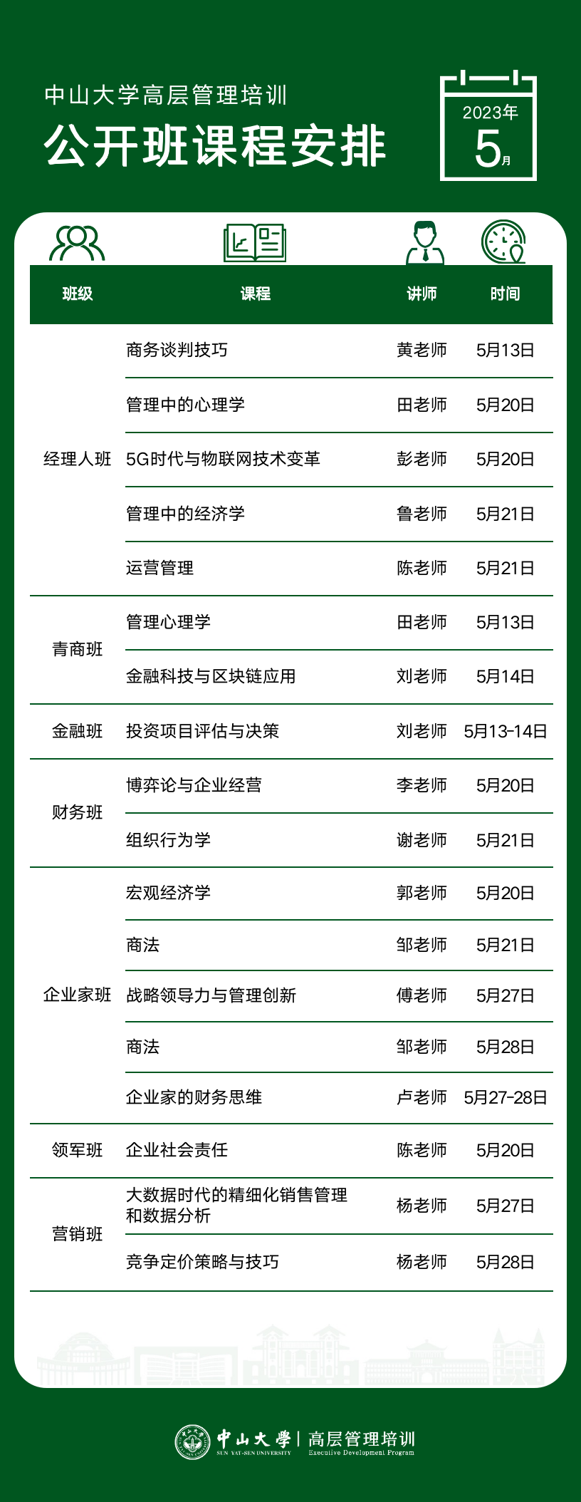 以下是高层管理培训公开课5月课程表,欢迎咨询报名加入新班!