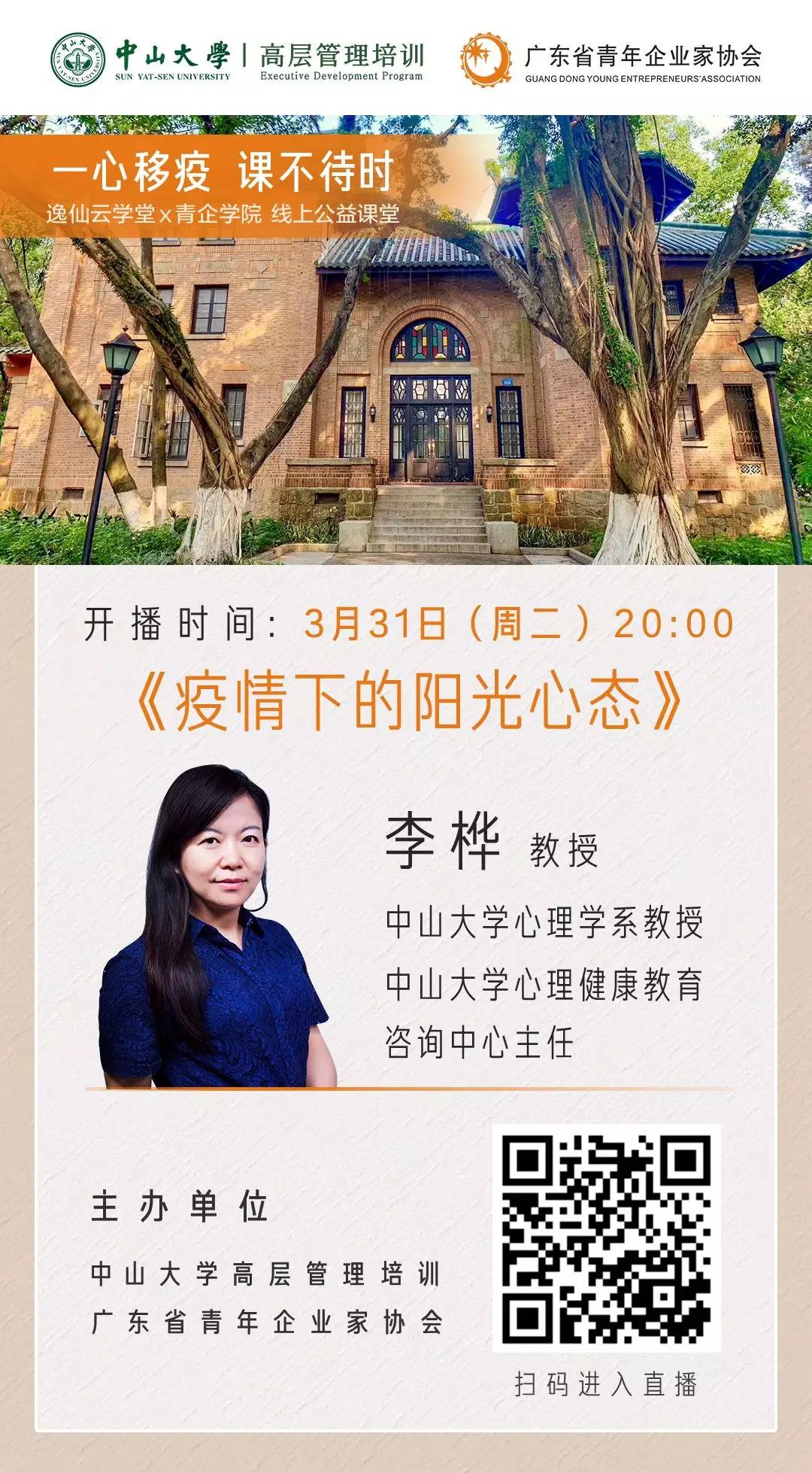 导航痕迹 yl9193永利集团岭南学院高层管理教育(EE)中心 活动预告 逸仙云学堂丨李桦教授《疫情下的阳光心态》 扫描此二维码分享 逸仙云学堂丨李桦教授《疫情下的阳光心态》 发布人:EE中心 发布日期:2020-03-13 活动时间 2020年03月31日 20:00 - 2020年03月31日 21:00 活动地址 逸仙云学堂线上课程