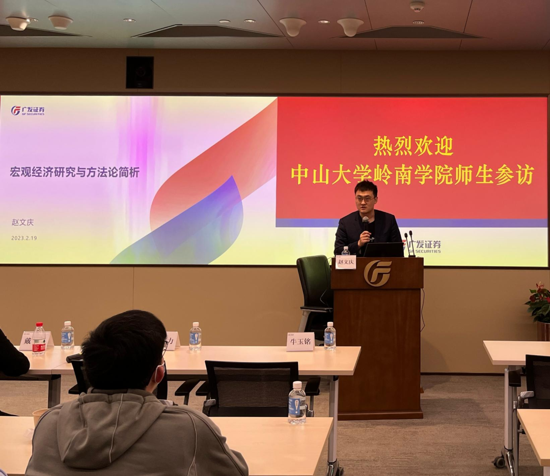 本次参访活动的第二站是广发证券股份有限公司的总部大厦。广发证券宏观策略研究部首席研究员,岭南学院优秀校友赵文庆学长为同学们进行了主题为《分析国内外宏观经济发展形势,介绍宏观研究方法论》的分享。