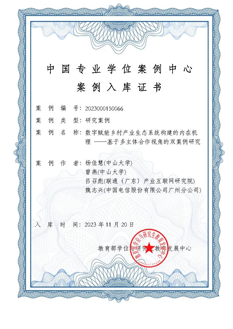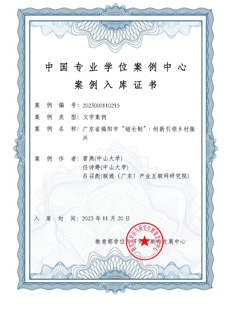 近日,中国专业学位案例中心公布了新一批中国专业学位案例中心案例库的案例名单,我院曾燕教授团队撰写的两个主题案例顺利通过评议,被中国专业学位案例中心收录入库。两个有代表性、创新性的案例研究成果分别是:《数字赋能乡村产业生态系统构建的内在机理 ——基于多主体合作视角的双案例研究》、《广东省揭阳市“链长制”:创新引领乡村振兴》。
