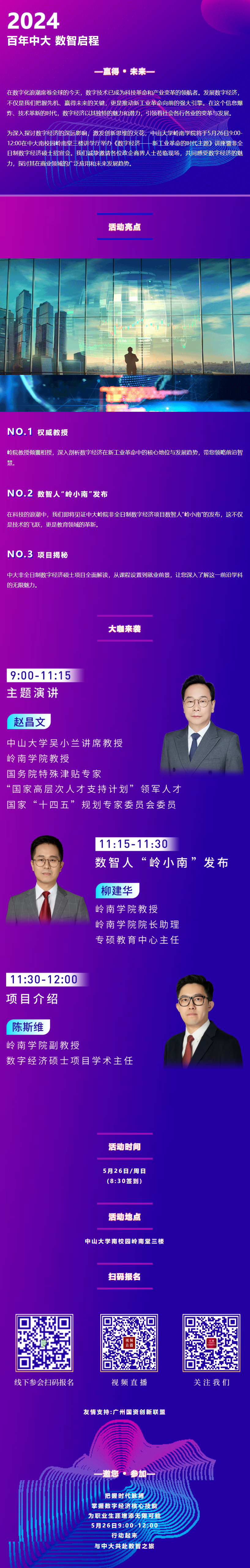导航痕迹 yl9193永利集团岭南学院专硕教育中心 新闻动态 招生资讯 百年中大 数智启程丨《数字经济——新工业革命的时代主题》讲座暨非全日制数字经济硕士招宣会 扫描此二维码分享 百年中大 数智启程丨《数字经济——新工业革命的时代主题》讲座暨非全日制数字经济硕士招宣会 发布人:袁园 发布日期:2024-05-12 编辑:袁园、罗悦、欧彦明 审核:漆剑 审核发布:柳建华