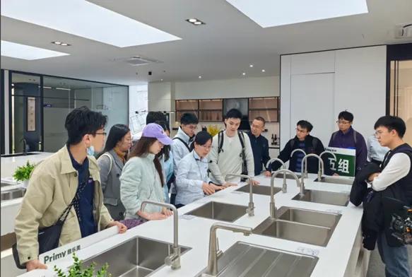 抵达普乐美立新厂区后,师生一行前往大励展厅,集中参观了用于外贸出口的水槽、龙头及花洒等系列产品。展厅中琳琅满目的产品,不仅直观地展现了普乐美强大的生产制造能力,更充分体现出其卓越的设计水平与持续创新的品牌精神。展厅内,水槽与水龙头展区重点展示了304不锈钢材质的一体拉伸成型工艺和无电镀表面处理技术,这不仅避免了传统铜质龙头可能产生的重金属风险,也呈现出柔丝哑光的高级质感。此外,水槽产品的静音下水系统和双层隔渣设计,有效解决了厨房堵塞与渗漏等问题。展厅内也设有家居生活馆,以场景化陈列打破传统展厅的桎梏,其中“亲子卫浴空间”采用Hello Kitty联名设计,成功赋予产品情感价值。