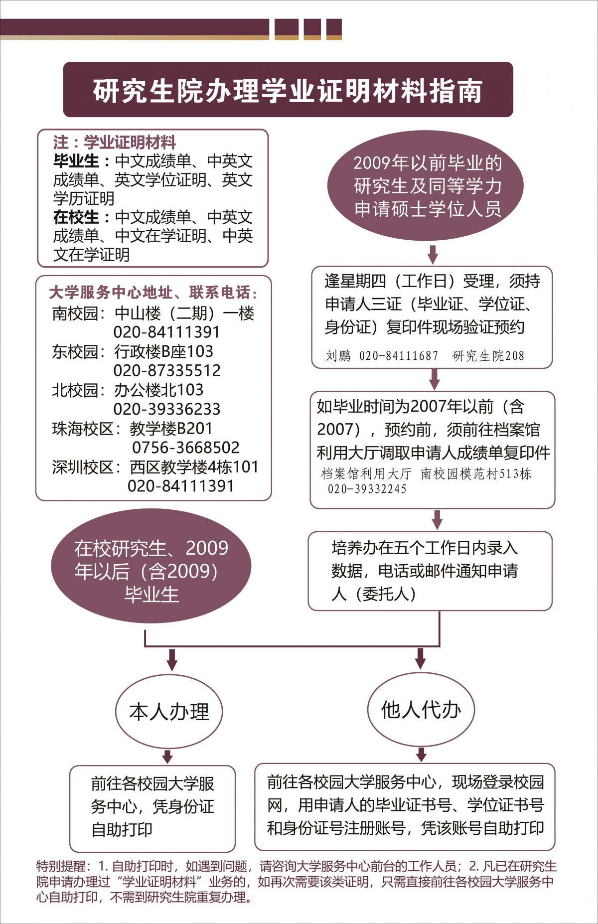 导航痕迹 yl9193永利集团岭南学院岭南校友 校友服务 服务事项指引 研究生学业证明(成绩单、中英文学历学位证明)材料办理流程 扫描此二维码分享 研究生学业证明(成绩单、中英文学历学位证明)材料办理流程 发布人:高级管理员 发布日期:2016-10-11 学校说明链接:http://graduate.sysu.edu.cn/article/310 温馨提示:大家来南校办理之前请务必和研究生院的老师确认材料是否已齐备。