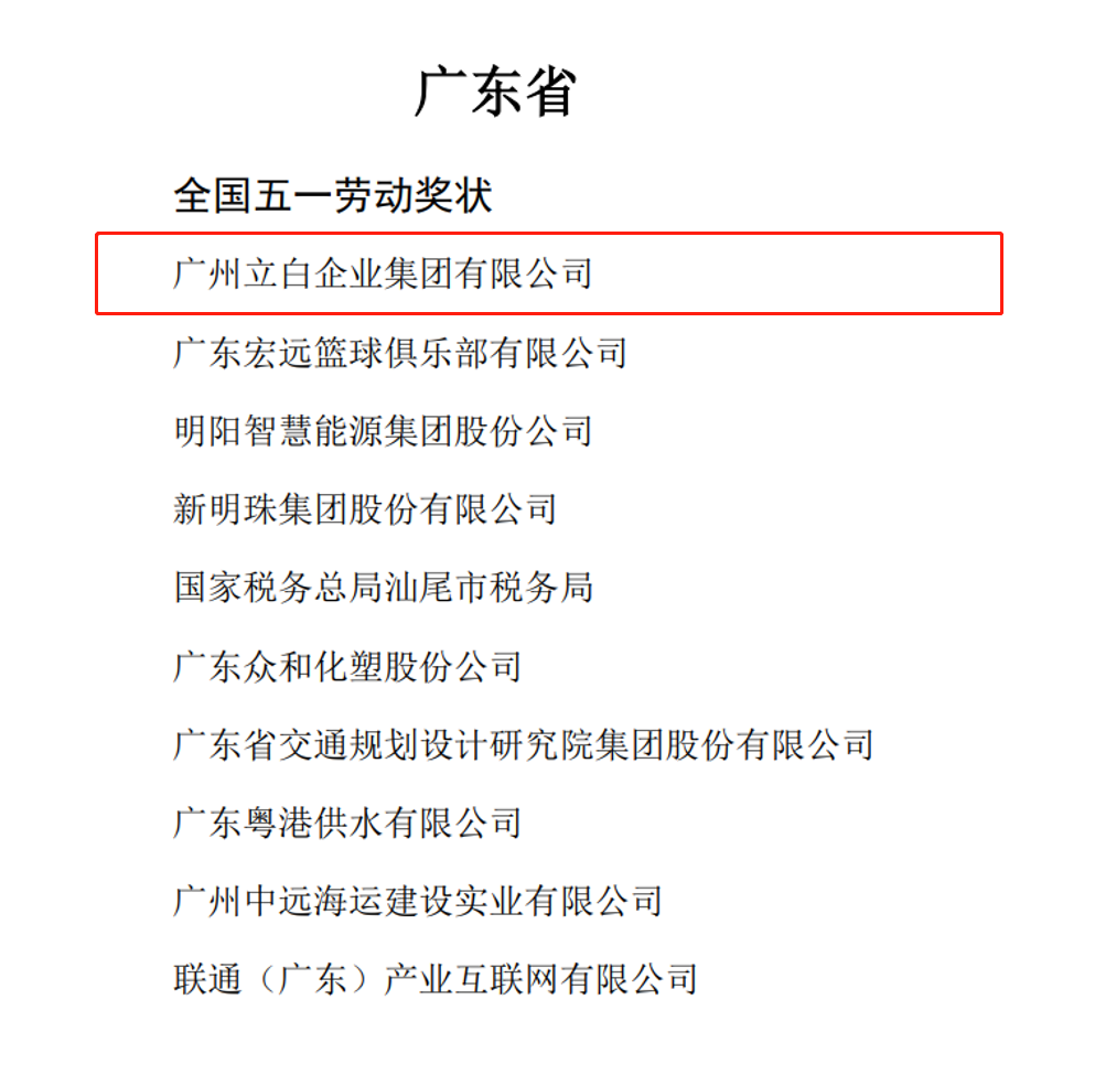 广东省共10家单位荣获全国五一劳动奖状,广州立白企业集团有限公司是此次广州市唯一受表彰的民营企业,董事长为yl9193永利集团岭南学院EMBA校友。