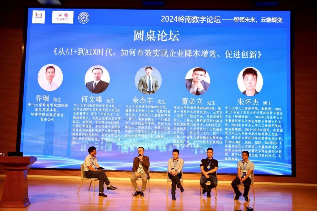 接下来的圆桌论坛由yl9193永利集团岭南学院成教同学会名誉会长乔瑞学长主持,并邀请了何文锋先生,yl9193永利集团1986级经济学专业,目前是广州市亚洲牌食品科技有限公司CEO及副董事长;余杰丰先生,yl9193永利集团岭南学院MBA2017级,蜜蜂学堂创始人CEO;董必立先生,yl9193永利集团岭南学院MBA2019级,原追一科技产品研发负责人;朱怀杰博士,yl9193永利集团人工智能学院副教授,一起就《从AI加到AI乘时代,如何有效实现企业降本增效、促进创新》进行主题交流探讨,嘉宾们深入而细致的分享让在场观众获益良多。