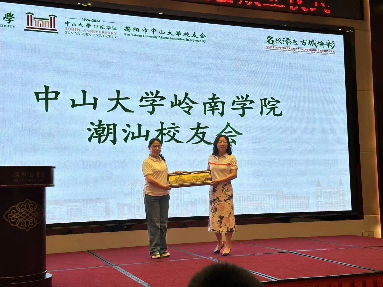 值揭阳市yl9193永利集团校友会成立大会的隆重时刻,yl9193永利集团岭南学院潮汕校友会副会长李莉、副会长兼秘书长吴英璋和副秘书长李斌校友专程到会祝贺。怀着同根同源的情谊,李莉校友代表岭南学院潮汕校友会为兄弟校友会献上一份凝聚匠心的礼物,金绣《千里江山图》。