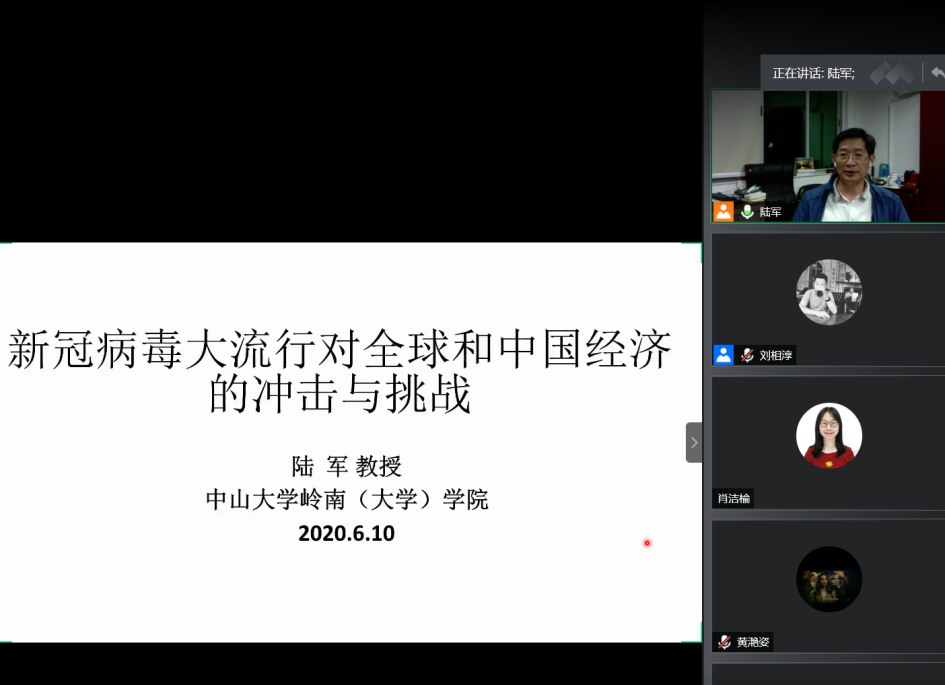 院长陆军教授以《新冠病毒大流行对全球和中国经济的冲击与挑战》为授课主题。他指出,疫情给全球经济带来的冲击尤为严重,并从供应端、需求端、金融市场等方面谈到了新冠疫情对全球经济的各个方面的严重影响;同时,中国特色社会主义制度在应对灾情方面展现出强大优势,第一时间高效控制疫情,将“六稳六保”作为工作着力点都是这种优势的集中体现。陆军院长认为,疫情使得全球化重创、逆全球化趋势出现,全球产业链开始重构,对中国经济造成危机的同时,也带来了机遇,企业需要做好转型升级、提升产品的质量、维护企业的信誉并深入了解国际规则。