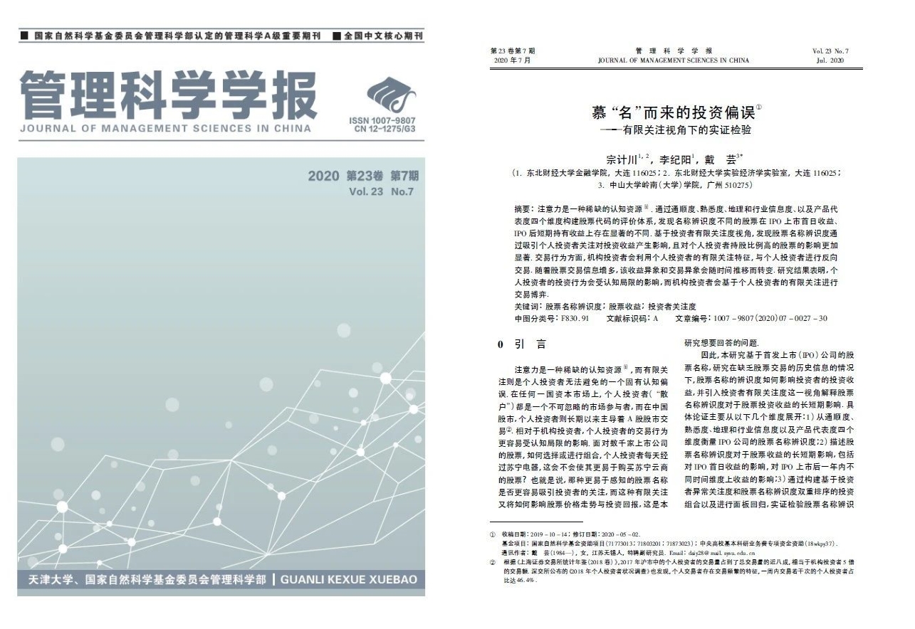 我院戴芸副教授与东北财经大学宗计川教授、博士生李纪阳在管理学中文顶级期刊《管理科学学报》2020年第7期发表了题为《慕"名"而来的投资偏误—有限关注视角下的实证检验》的学术论文。