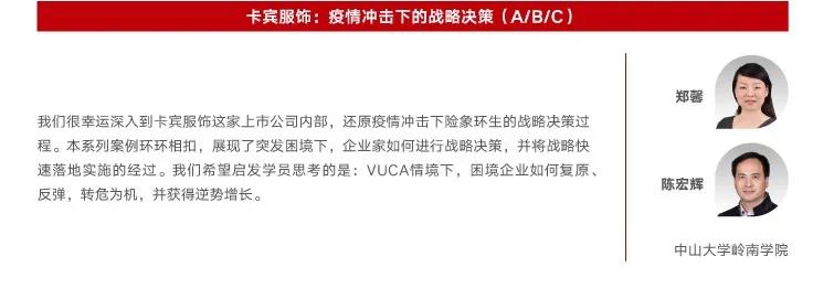我院获奖案例由郑馨副教授与陈宏辉教授共同开发。他们对案例企业——卡宾服饰这家上市公司非常了解,持续跟踪研究。在对卡宾先生(杨紫明,我院EMBA2007级春季班学生)进行深入访谈之后,获得了很多宝贵的一手资料和信息。