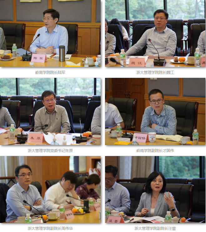 4月15日上午,浙江大学管理学院院长魏江,党委书记朱原,副院长周伟华、汪蕾等一行11人莅临我院开展交流活动。我院院长陆军,党委书记陈险峰,副院长才国伟、陈刚等院领导及相关负责人参加了会谈。会谈于岭南堂伍沾德会议室举行,双方就人才培养、学科建设、队伍建设、专业学位办学及行政管理等话题展开交流。
