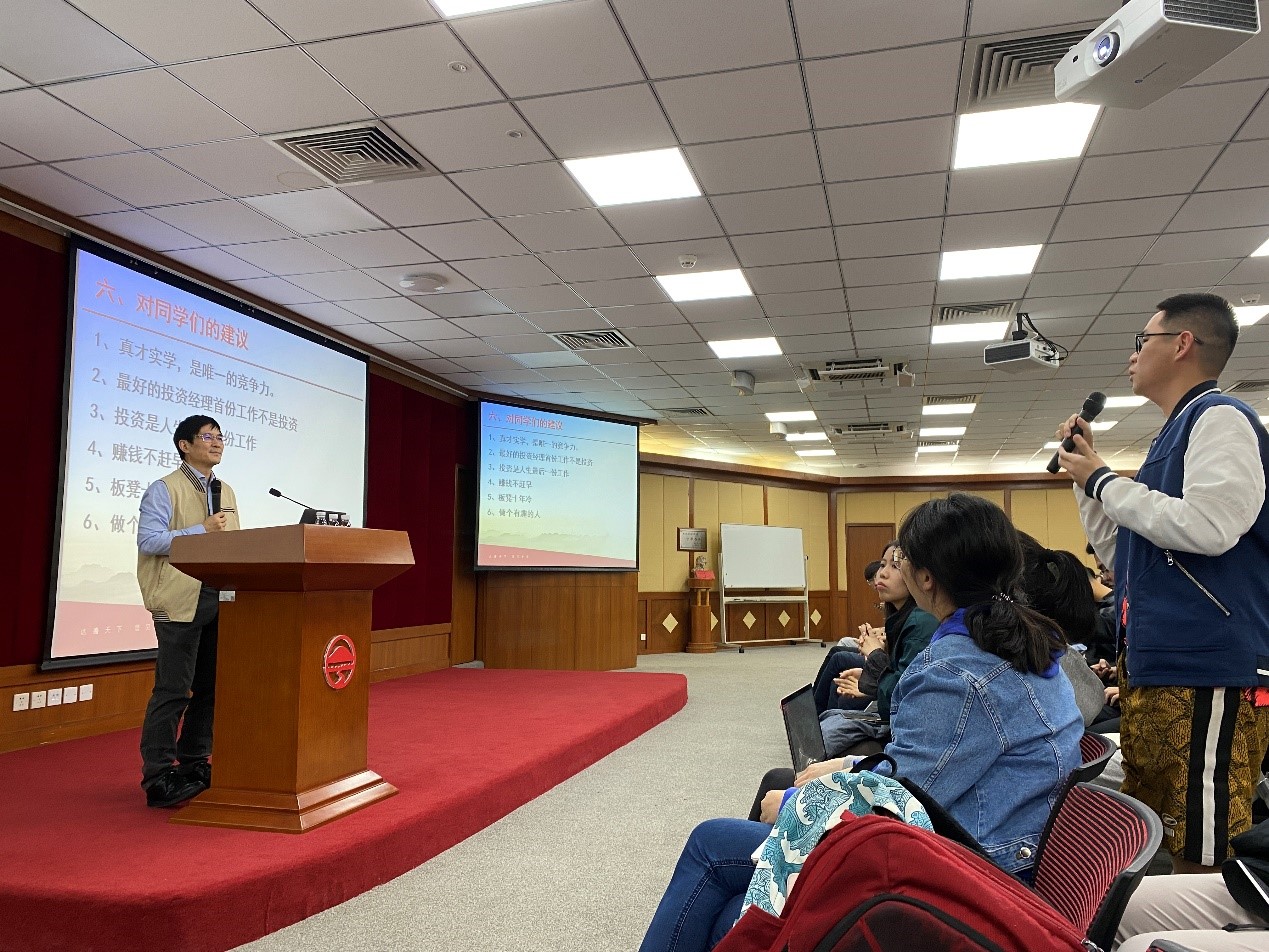 在问答环节中,同学们积极提问,提出了诸如投资中应该看重创业者的何种特质,大学生应该如何选择实习,从过去的投资案例中吸取了哪些经验和教训等问题。舒小武先生以其丰富的从业经验与知识储备,从业界的角度作出了精彩且富有见地的回答。在热烈的讨论中,本学期第二次金融高管讲座顺利结束。