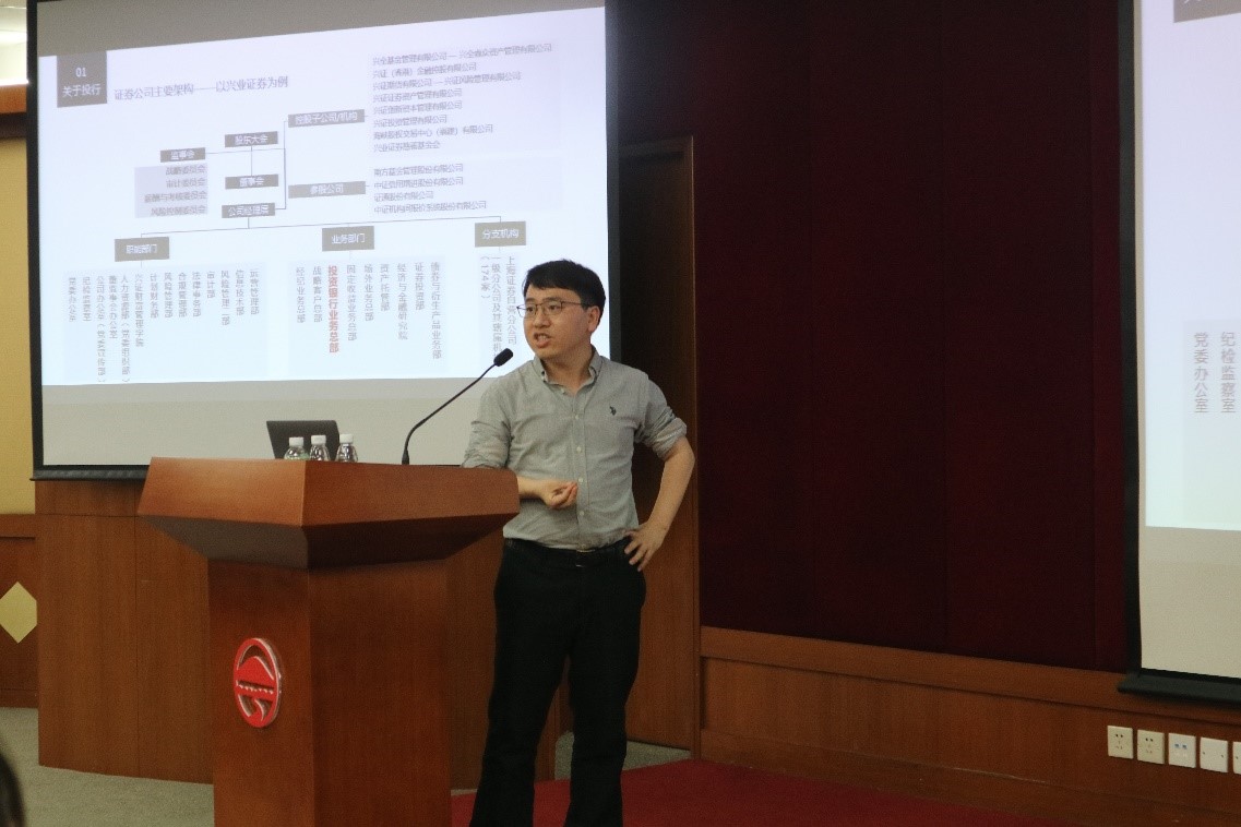 贾晓斌先生首先介绍了证券公司投行业务的相关情况。他用简明扼要的语言为同学们介绍了A股市场中主板、中小板、创业板和科创板的现状,并以兴业证券为例介绍了证券公司内部的主要部门架构。