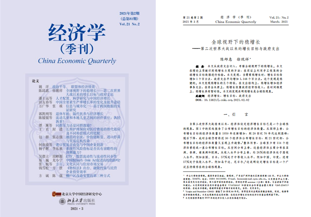 我院博士研究生陈邱惠、徐现祥教授在经济学中文顶级期刊《经济学(季刊)》2021年第21卷第2期发表了题为《全球视野下的稳增长——第二次世界大战以来的增长目标与政府支出》的学术论文。