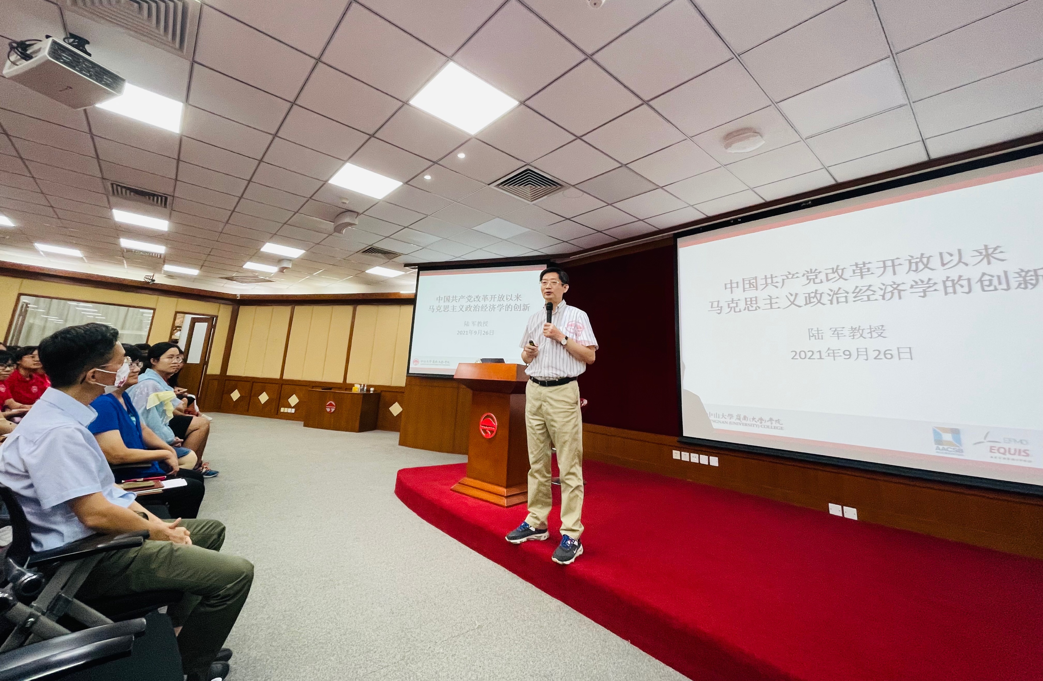 陆军院长以“中国共产党改革开放以来马克思主义政治经济学的创新”为题,结合习近平总书记在“七一”讲话中的内容,回顾了改革开放以来党的历代中央领导在政治经济学方面的理论探索。他以生动事例着重阐发了习近平新时代中国特色社会主义经济思想的主要内容以及其重要的时代价值。他指出,中国特色的马克思主义政治经济学上升为科学理论体系的时机已经成熟,而如何将其上升为科学的理论体系成为当今中国经济学研究面临的重大课题。中国共产党风云激荡的百年史,就是马克思主义政治经济学中国化伟大工程的建设史,中国特色的马克思主义政治经济学具有广阔的发展前景,会成为具有世界性意义的重大理论体系。