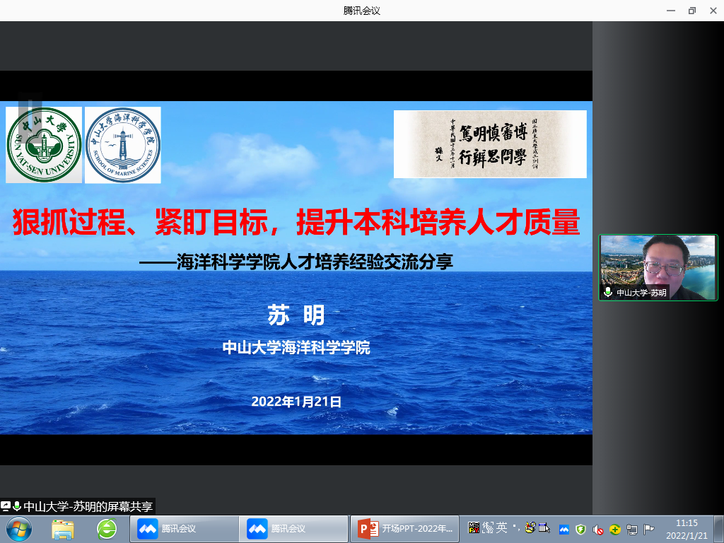 海洋科学学院副院长苏明教授以“狠抓过程、紧盯目标,提升本科培养人才质量”为题,做了线上主题演讲。苏明教授从课程思政、教学方式、考核模式、在线课程建设、教学团队等方面分享海洋科学学院人才培养的经验体会,介绍了新教师培训+院内听课、系列教材、课程思政、大学生科研训练等全方位人才培养举措。他强调,要换位思考、用“真心”对待学生;严管厚爱、用“诚心”打动学生;立德树人,用“仁心”引领学生。
