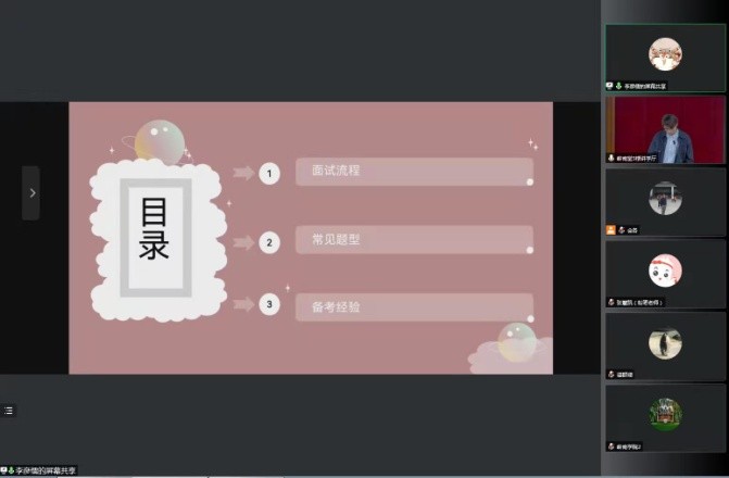 在四位嘉宾完成分享后,分享会进入问答环节。虽然隔着屏幕,但同学们提问的热情不减,大家都积极踊跃地在聊天框中打出了自己的问题。师兄师姐们挑选了一些问题作出了详细解答。分享会在热烈的氛围中落下帷幕。