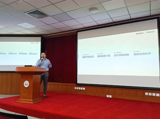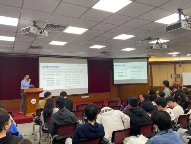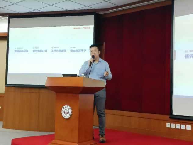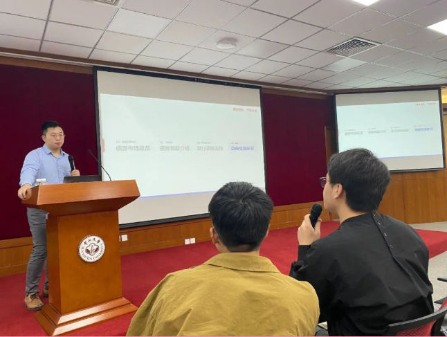 讲座主持人戴芸老师向同学们介绍了蔡卓炯先生的职业背景,并对嘉宾的到来表示诚挚的欢迎。蔡卓炯先生用简洁生动的语言介绍了债券市场的整体情况及各种类型的固定收益产品。讲座围绕债券市场总览、债券条款介绍和发行承销流程三个方面展开,干货满满,同学们受益匪浅。
