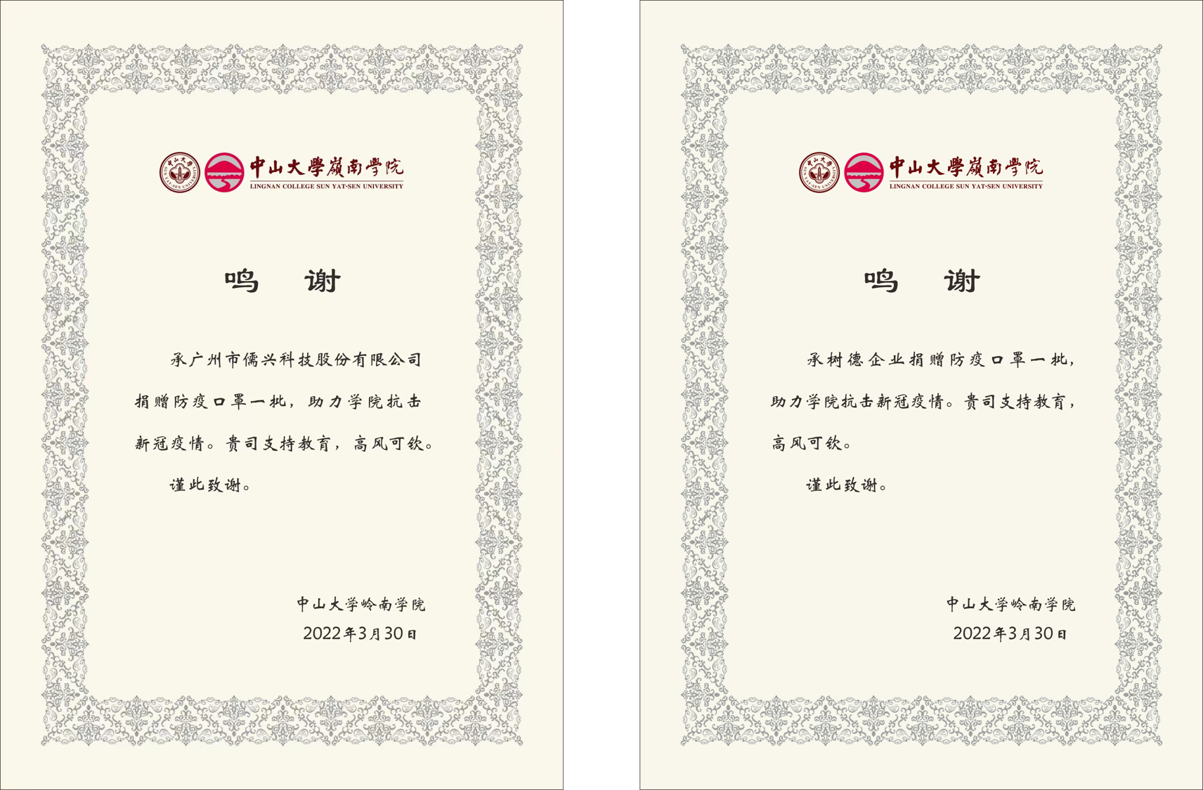 自疫情爆发以来,校友们心念母校,积极捐款捐物,大力支持学校防疫工作。在得知学院师生需要防疫口罩的需求后,校友企业广州市儒兴科技股份有限公司、树德企业先后向学院捐赠一次性使用医用口罩12万个和4万个(其中N95口罩1万个)。