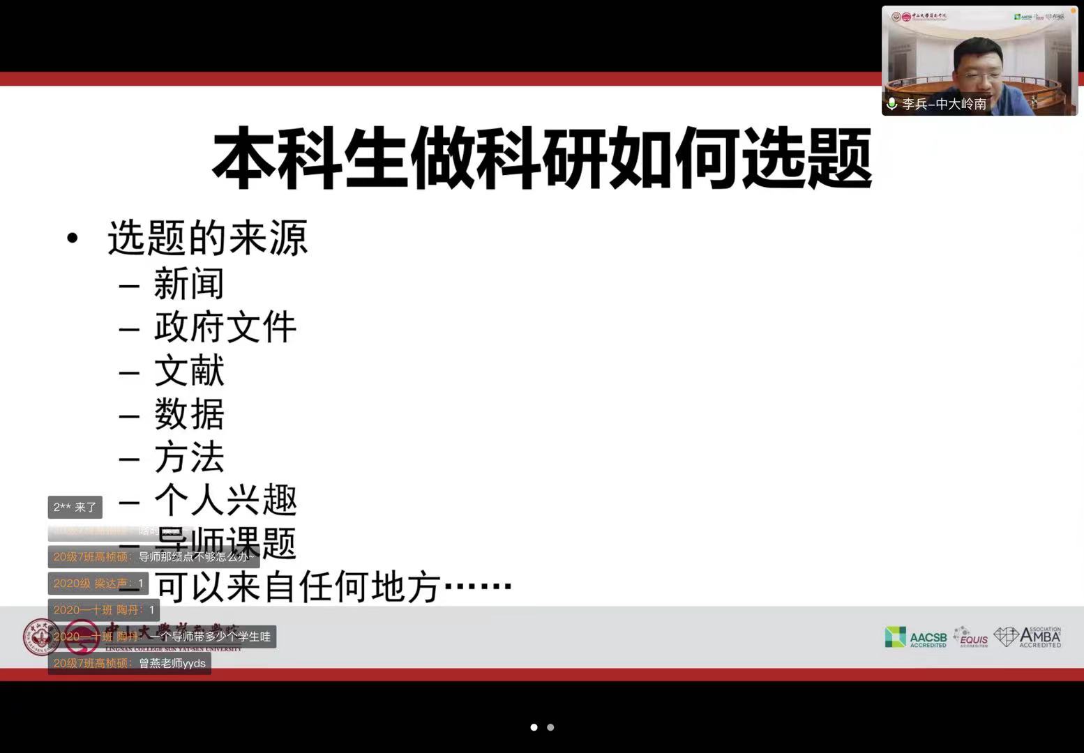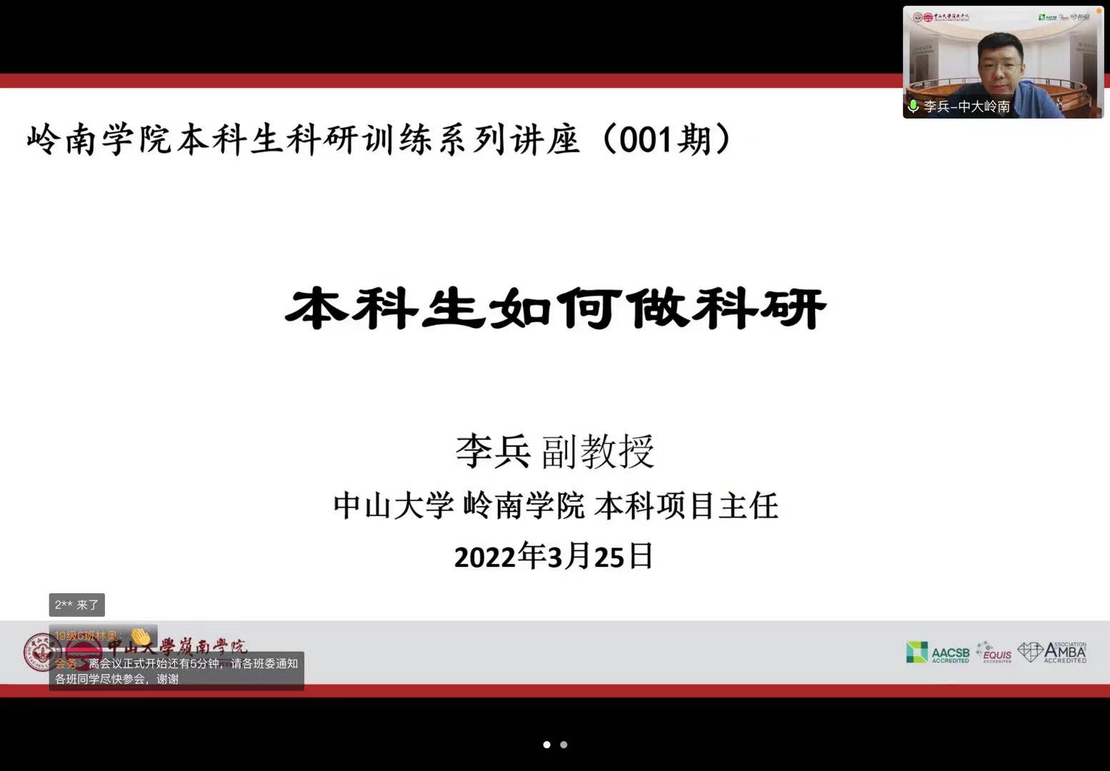 为激发学生的科研兴趣,推进落实学院的科研育人工作,提升人才培养质量,岭南学院于2022年3月25日晚于线上组织召开了本科生科研训练系列第一期讲座。本次讲座由岭南学院本科项目主任李兵副教授主讲,为我院2019级、2020级全体本科生做主题为“本科生如何做科研”的分享。
