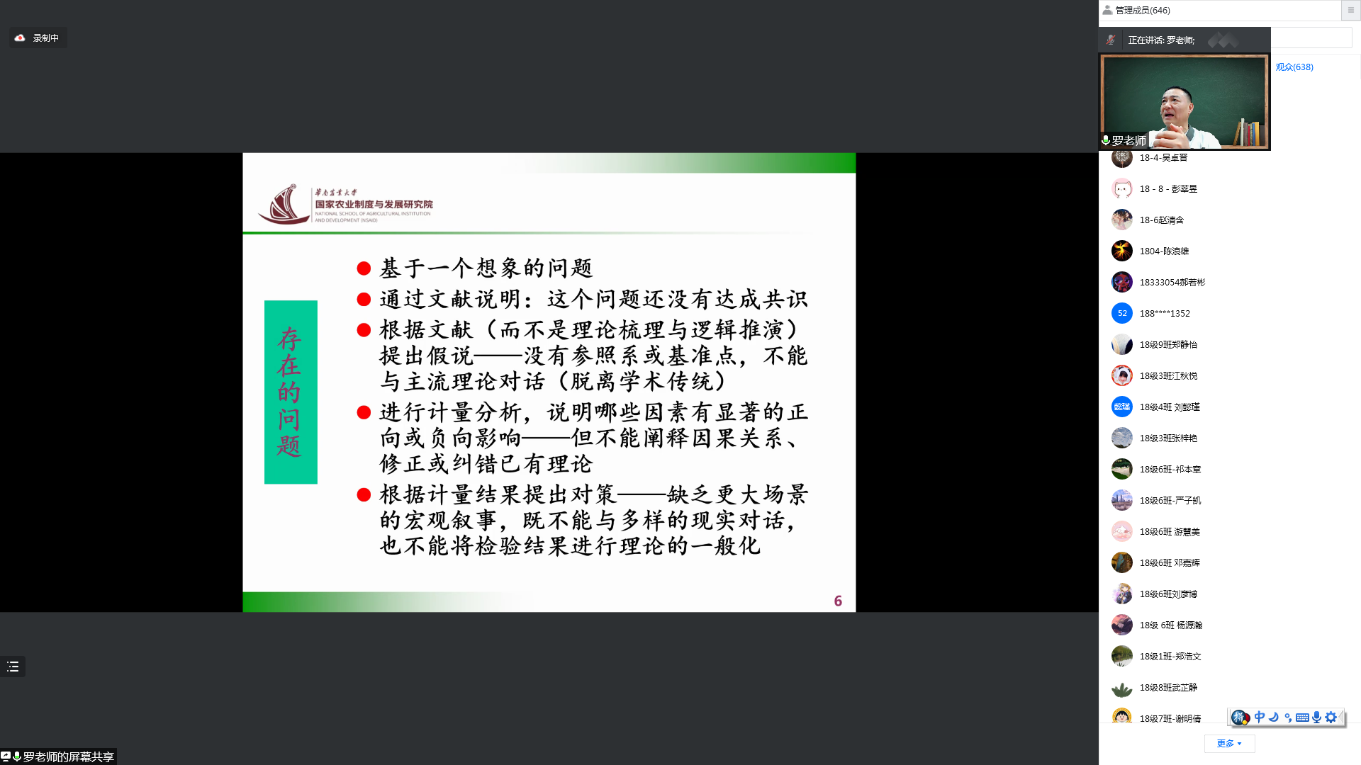 华南农业大学国家农业制度与发展研究院院长罗必良教授为我院同学们循序渐进地剖析了当前围绕农业农村问题的学术研究中存在的问题,并展示了团队的研究思想和成果。他向同学们介绍了当前我国农业经济领域的最主要刊物,通过对刊物载文的分析提出计量模型分析在近年的农业经济学研究中有着普遍而广泛的应用,然后进一步强调了文章中出现的较普遍的“八股式”研究的问题,呼吁同学们不可一味追求“硬”的数学模型,要避免做无逻辑的回归分析。“好的研究,是有现实问题、问题特征、研究视角、参照系与逻辑框架、分析工具构成的——分析范式的关键是将微观数据与宏观意义对接、将现实与理论链接”。