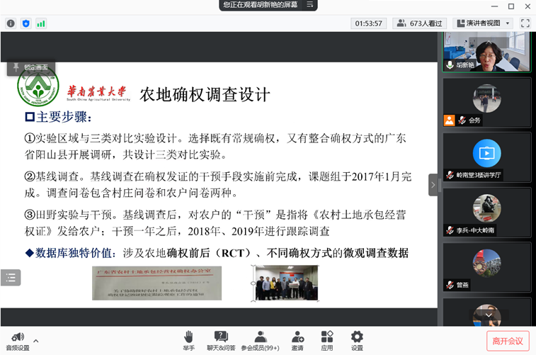 紧接着,华南农业大学国家农业制度与发展研究院执行院长胡新艳教授在分享中先为同学们揭示了中国经济快速增长“奇迹”背后的规律,强调了家庭承包制改革对于农业经济增长的贡献,而后介绍了近代中国的土地制度变迁,重点分析了2009年以来试点推进的农地确权政策。“2009年新一轮农地确权作为外生政策冲击,在空间和时间上逐步推进,这相当于在改革地区形成了一个准实验场景,为考察产权制度改革重要性提供了独特机会。”而胡教授团队研究的问题是不同农地确权实践方式对农户施肥行为的影响及其作用路径,以揭示农户不同施肥行为差异大产权制度根源,为完善确权政策为线索的农业绿色发展提供决策参考。