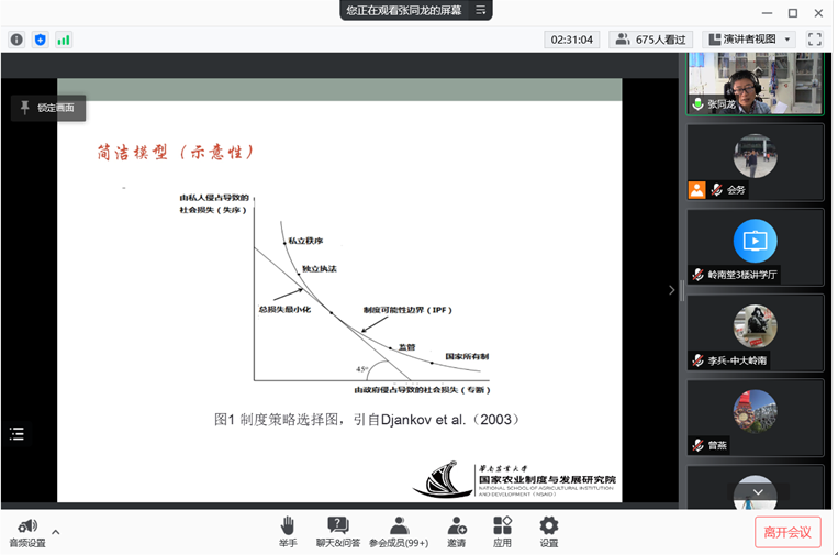 最后,华南农业大学国家农业制度与发展研究院张同龙教授从广东省雷州半岛的“祖宗地”现象这么一个小而独特的视角出发,分析制度如何塑造产权,不同的产权又如何影响土地流转市场的发育。在张教授的引领下,同学们学习了一个体现个人力量和政府力量对于产权的影响的模型,在理论层面比较分析了不同制度在统一框架下的表现,得知产权是政府和民间力量制衡的结果;分别从产权安全性和清晰性两个维度,实证了解土地制度塑造的产权状态;最后认知了产权对土地流转市场发育的影响,理解其内在作用机制在市场广度和深度方面存在异质性。