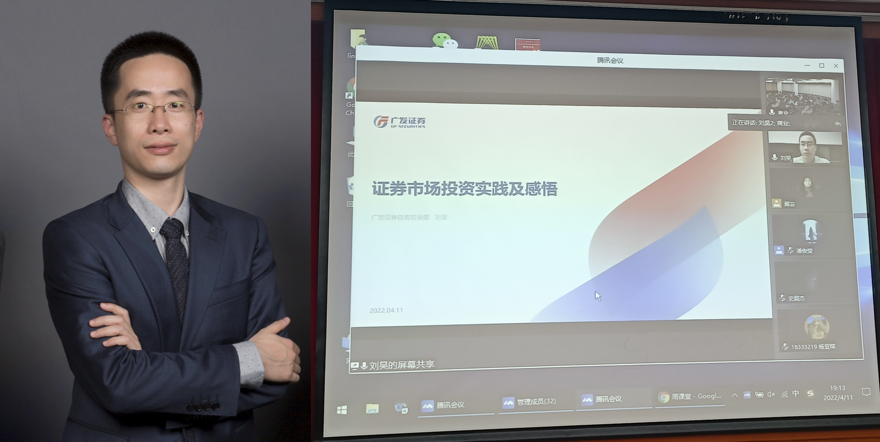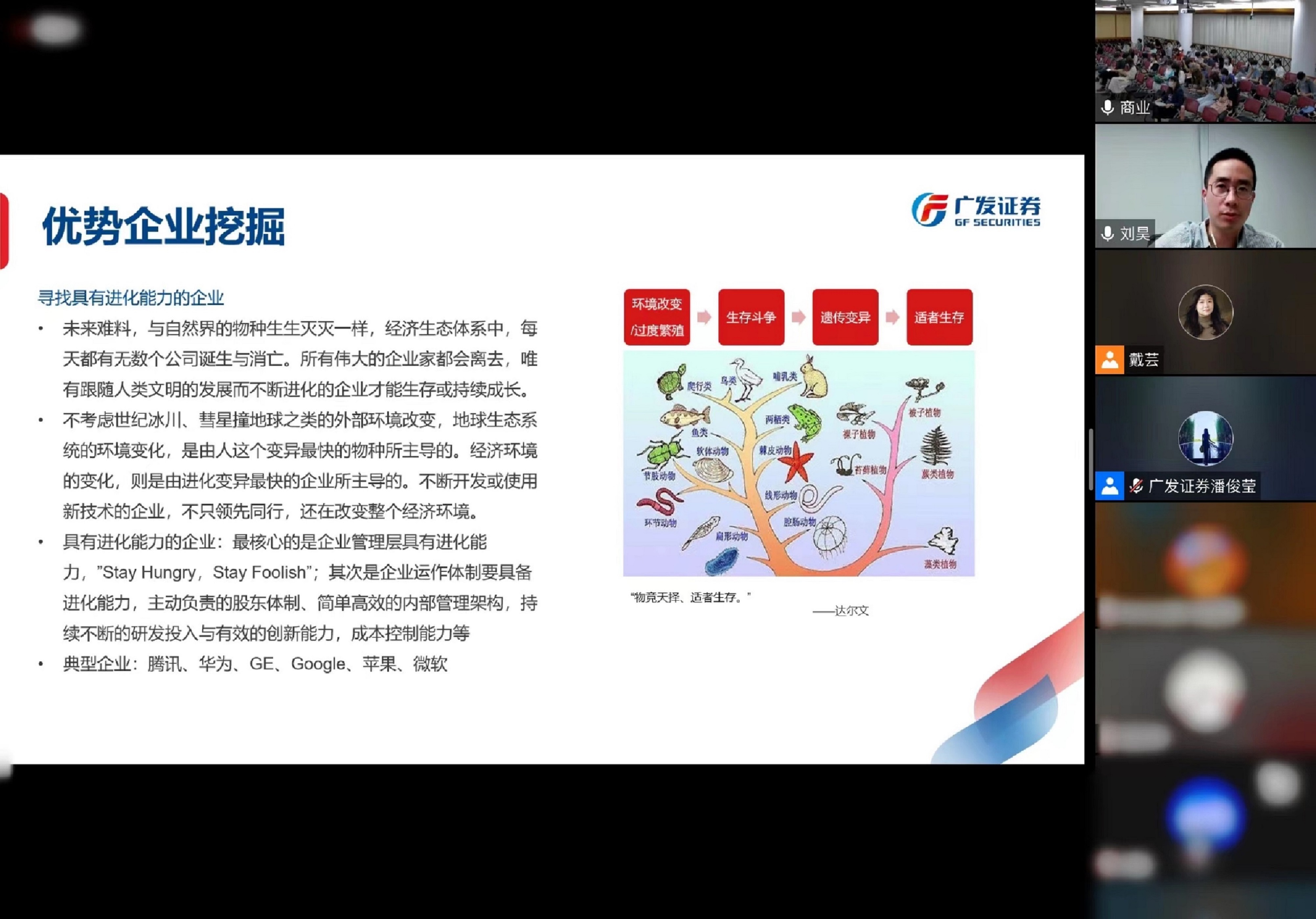 讲座主持人戴芸老师向同学们介绍了刘昊博士在银行及证券行业的职业背景,并对嘉宾的参与表示诚挚的欢迎。刘昊博士分享了他对证券投资实践的经验以及对企业价值的判断逻辑,为同学们带来一场引人入胜、说理透彻的线上讲座,进一步启发同学们对证券市场投资的深刻思考。
