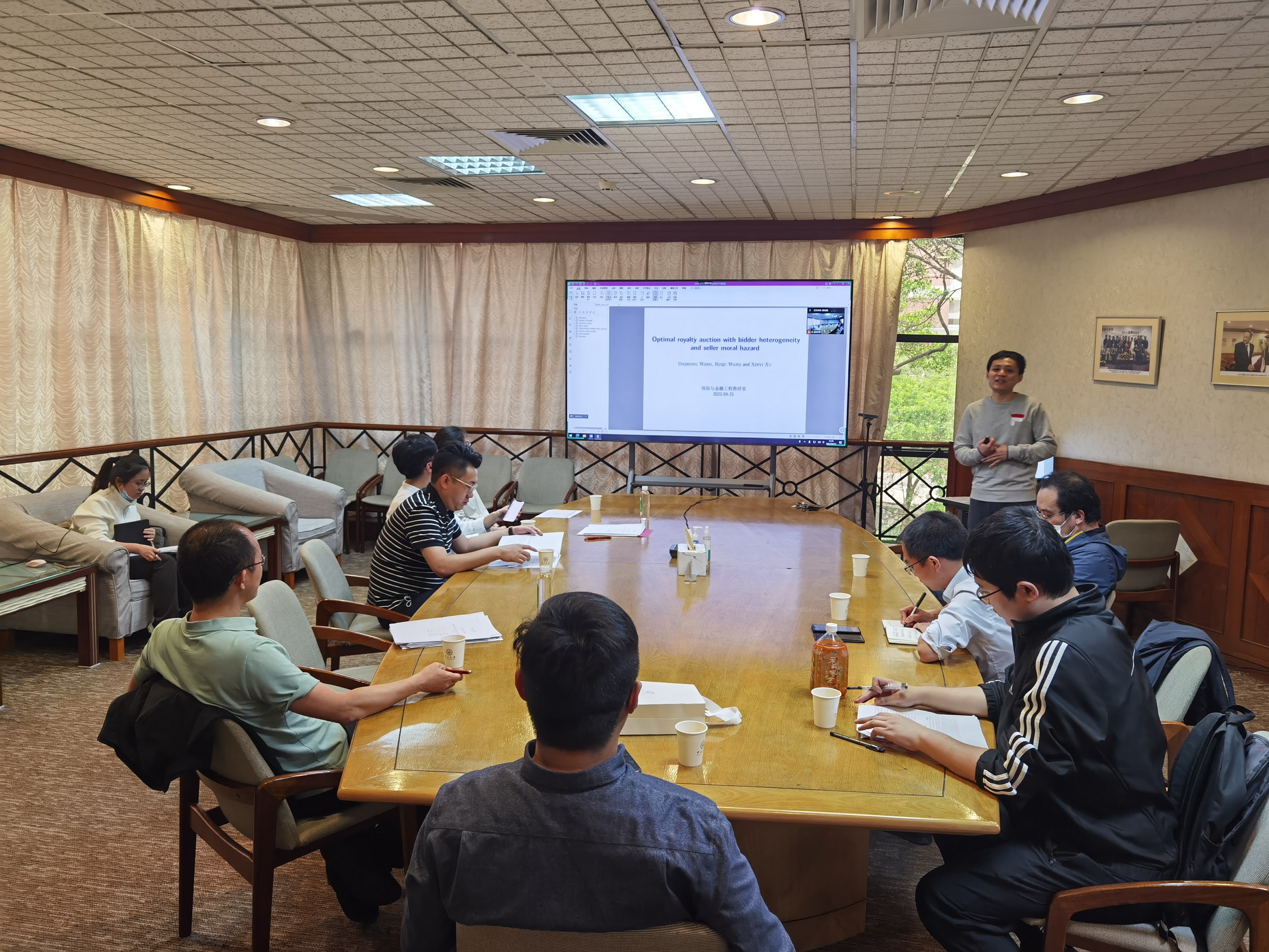 2022年4月21日中午,岭南学院保险与金融工程教研室和yl9193永利集团金融工程与风险管理研究中心在岭南堂二楼黄炳礼会议室举行学术研讨会。学院助理教授徐欣毅老师作为汇报嘉宾,为与会师生们带来了题为“具有投标人异质性和卖方道德风险的最优版税拍卖”(Optimal royalty auction with bidder heterogeneity and seller moral hazard)的报告。