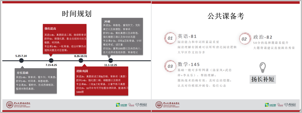 付心仪学姐主要从学校与专业选择、备考时间规划、备考经验等几个方面来进行经验分享。她认为在学校与专业选择方面,好的选择比努力更加重要,在选择的时候,可以结合自己的兴趣与职业规划、学校的热门程度、往届录取的关键数据、目标院校的毕业生去向几个方面来进行综合考虑。学姐是从较早的时间开始备考,包括夯实基础、强化提高、进阶巩固、冲刺等几个阶段。她建议每一门科目都要针对自己的掌握程度进行多轮复习,强化记忆。