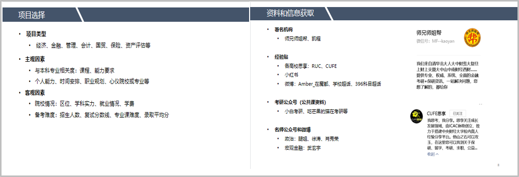 王潇阳师姐从院校介绍、个人规划、科目经验及备考心得四方面来分享她的考研经验。师姐首先给我们介绍了她所考的人大财政金融学院金融专硕项目,该项目招生人数和分数线稳定,初试对数学能力要求低,复试被刷概率小,且近两年复试只有面试。此外,学姐还给我们提供了一些可供参考的获取信息途径,如师兄师姐帮等。对于备考复习的建议,师姐认为学习时间要量力而行,而且要注重专业课的背诵。