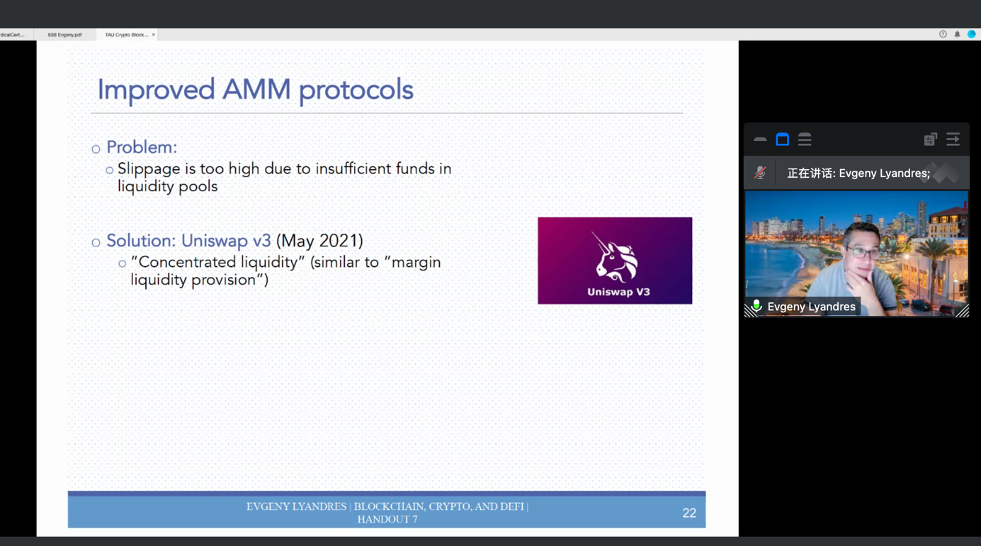 Evgeny Lyandres教授担任Journal of Corporate Finance 的联合主编和多个期刊的副主编,他的成果发表在JF, JFE, RFS, MS, JB, RF, JFQA等多个顶级金融期刊上。应我院戴芸老师的邀请,Evgeny Lyandres教授分别在今年1月和5月开展了8次精彩的线上讲座,分享了他对于“区块链、加密货币和去中心化金融”(Blockchain, Crypto Currencies, and Decentralized Finance) 的理解和研究。该课程内容详实,讲授深入浅出,加深了我院师生对区块链等金融科技话题的认知和思考。