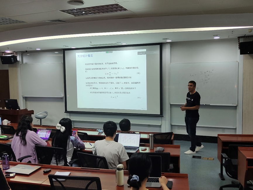 2022年7月11日到7月13日,上海财经大学王子副教授给同学们带来了主题为《结构模型估计方法》的专题讲座。王子副教授首先介绍了国际贸易中经典的李嘉图比较优势理论,随后讲解了复杂的EK模型、贸易政策分析与CP模型等,最后讲解了城市与区域经济学中的空间结构模型应用。他在讲授过程中,耐心地向同学们详细讲解了模型推导、模型解释、模型参数估计、软件使用等方面,为同学们了解并使用相关知识打下了坚实的基础。