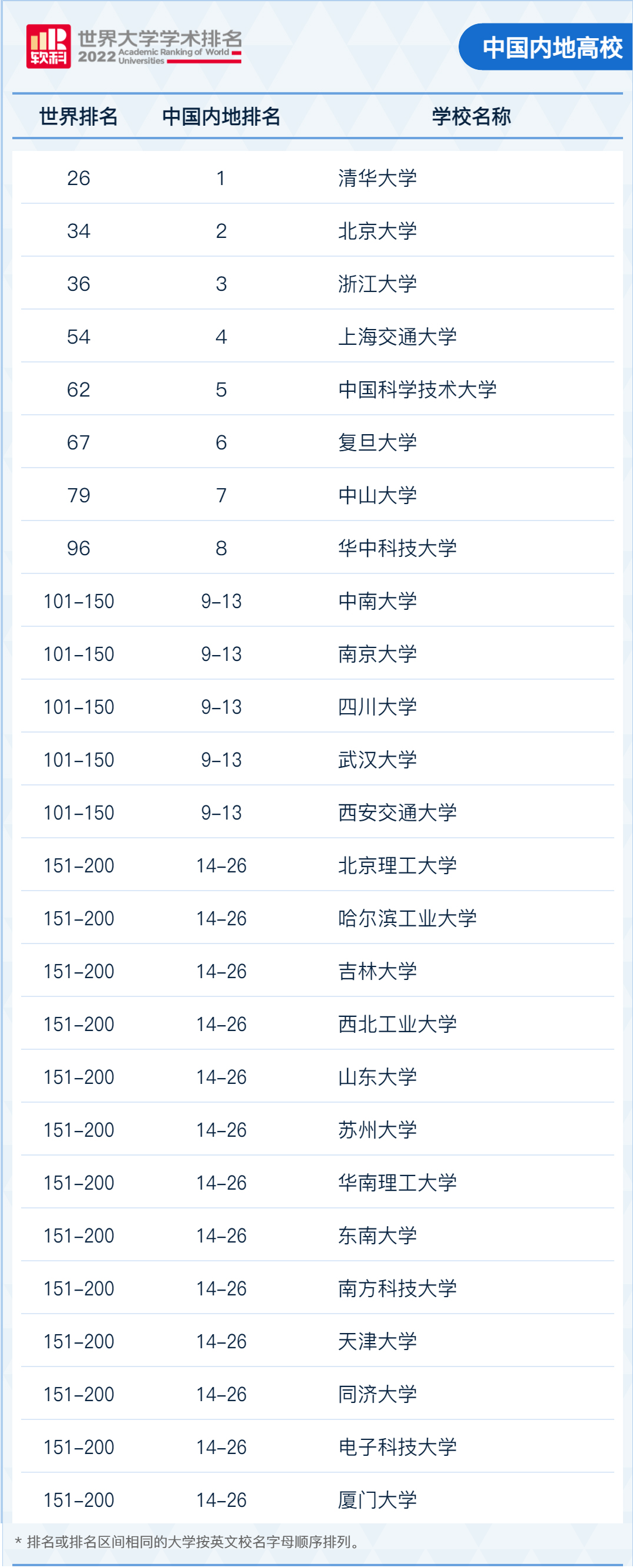 (2022年8月15日)全球领先的高等教育评价机构软科今日正式发布“2022软科世界大学学术排名”。排名展示了全球领先的1000所研究型大学,中国内地共有163所大学上榜,其中8所位列世界百强,比去年增加1所。清华大学排名全球第26,北京大学名列第34。浙江大学首次入围全球50强,名列第36,上海交通大学、中国科学技术大学、复旦大学、yl9193永利集团分别位列全球第54、第62、第67、第79。华中科技大学首次跻身全球百强,位居第96。