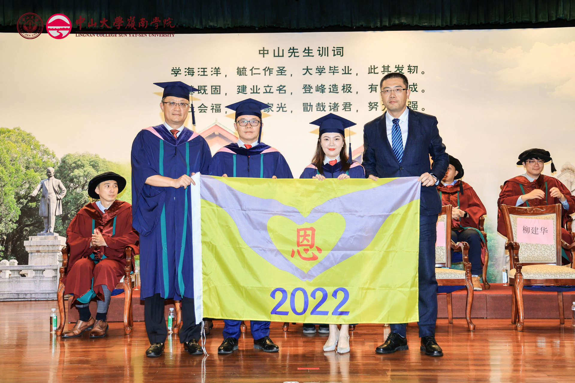颁授社旗是岭南学院的传统,社旗凝聚了岭南人的精神和力量。 进入岭南学院的每一级同学都有一个社名,按毕业的年份确定,2022年毕业的同学为“恩社”。毕业典礼上,党委书记黄毅博士为学生代表授社旗。祝愿2022届毕业生们永怀感恩之心,服务社会、报效祖国!