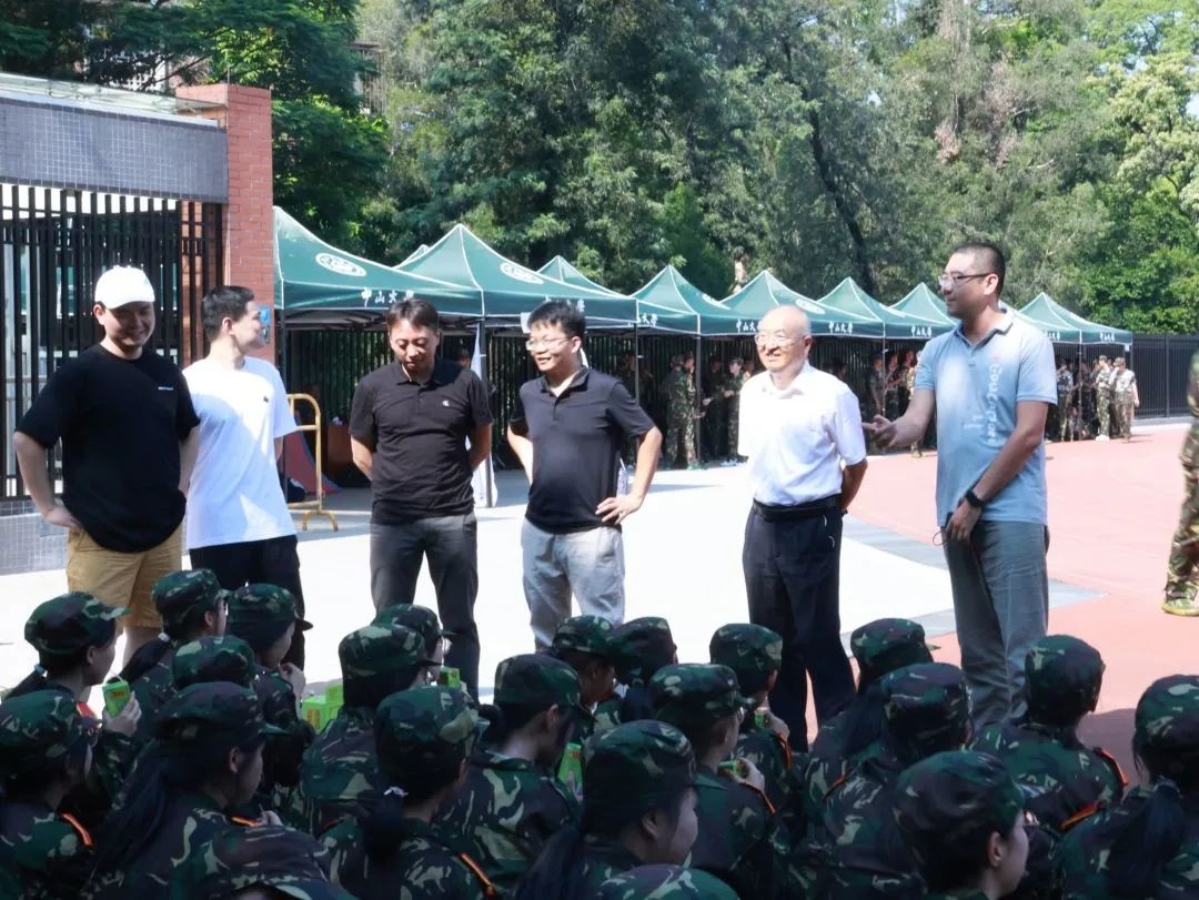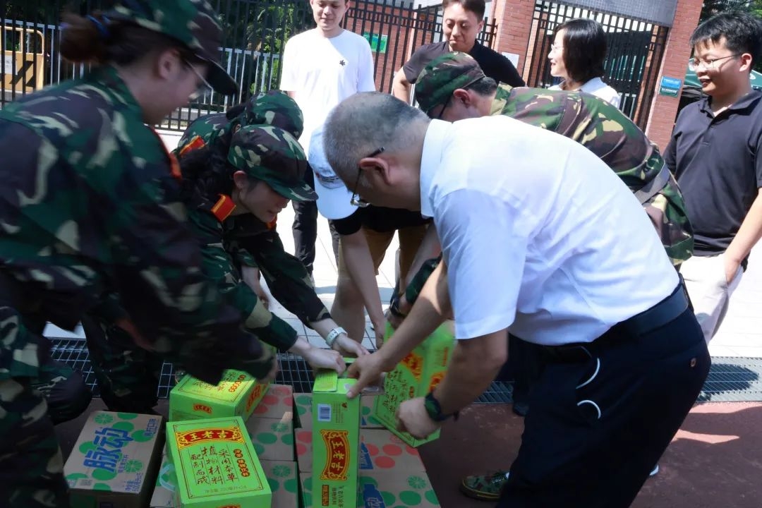 学院领导送的是最有助于军训解暑的王老吉和脉动,虽朴素却是最为刚需。看着同学们满足的笑容,黄毅书记兴致盎然地和大家分享起了他当年的军训经历,并现场演示军训的正确坐姿,通过质朴的话语与行动使大家在紧张的训练之余得以开怀大笑,放松身心,而后以更昂扬的姿态面对接下来的挑战。