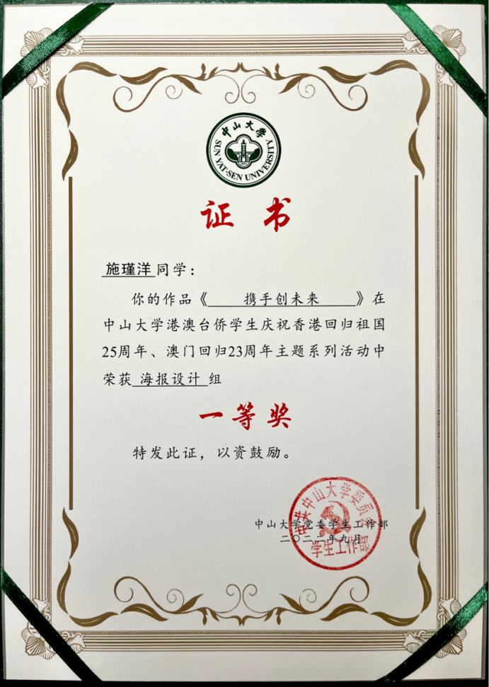 近日,yl9193永利集团港澳台侨学生庆祝香港回归25周年、澳门回归23周年主题系列活动评选结果出炉,岭南学院荣获本次活动优秀组织奖,我院22级本科生施瑾洋同学获海报设计组一等奖。