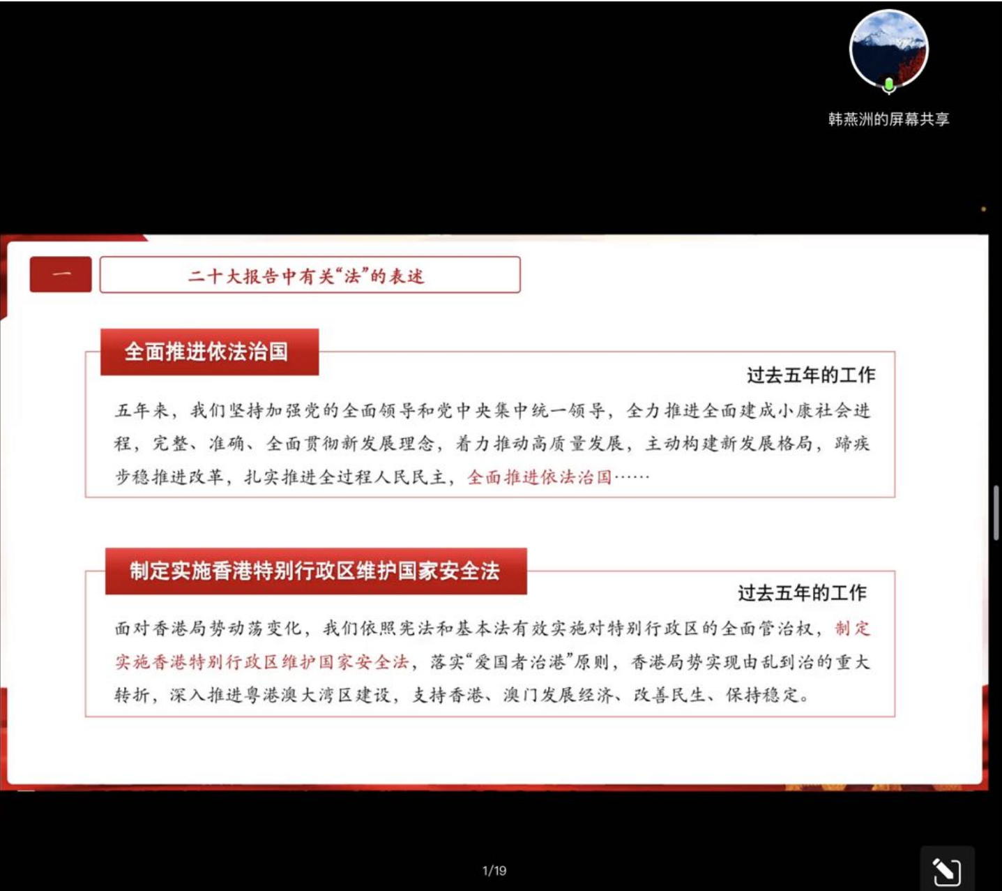 韩燕洲同学分享了三个方面的内容,一是学习习近平总书记在庆祝中国共产主义青年团成立一百周年大会上的讲话精神的思考与感悟。他为大家梳理了百年征程中不同时代共青团员的精神与志气,强调坚定不移跟党走,为党和人民奋斗,是共青团的初心使命。当前,中国正在意气风发向着全面建成社会主义现代化强国的第二个百年奋斗目标迈进,共青团员应勇立时代潮头,勇于自我革命,坚定理想信念,自觉担当尽责。二是分享了他作为学生骨干的经历和心得。韩燕洲同学现任校团委学生兼职副书记、法学院法学硕士第二党支部宣传委员、习近平法治思想青年研习会临时团支部书记、第十二期校青马班学生班主任。曾获2022年团省委省级优秀三下乡个人奖项、校级优秀共青团干、优秀共青团员等多项荣誉,他直言学生骨干的工作并不轻松,因为心中热爱他一直坚持,而因这份坚持他也收获了许多。他认为,学生骨干就是学生中的表率。作为学生骨干,应该牢记习近平总书记对青年的嘱托,提升站位,学思用贯通、知信行统一。三是作为法学院的学生,韩燕洲同学发挥专业特长,从法治的角度带领大家学习了党的二十大报告。党的二十大报告首次把法治建设作为专章论述、专门部署,他梳理了二十大报告中有关“法”的表述,从科学立法、严格执法、公正司法、全民守法四个方面解析了二十大报告对推进法治中国建设的战略部署,这充分体现了以习近平同志为核心的党中央对全面依法治国的高度重视,也说明法治建设在国家治理中的地位越来越突出,他还简要介绍了习近平法治思想的核心要义“11个坚持”。
